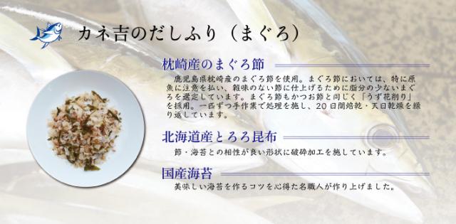 ●カネ吉のだしふりかけ(まぐろ):まぐろのふし(国内製造)、乾海苔(国内製造)、昆布(北海道産)、醸造酢" ■生産国:日本