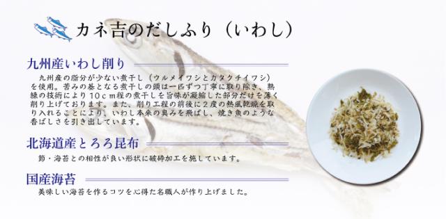 ●カネ吉のだしふりかけ(いわし):いわしの煮干(国内製造)、乾海苔(国内製造)、昆布(北海道産)、醸造酢