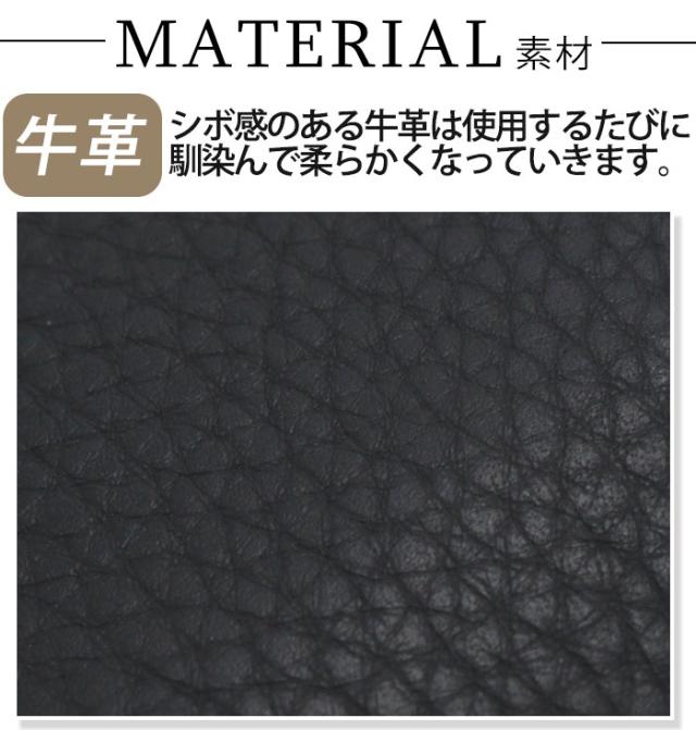 本体素材は柔らかい質感の牛革を使用しており、シボ感のある牛革は使用するたびに馴染んで柔らかくなっていきます。