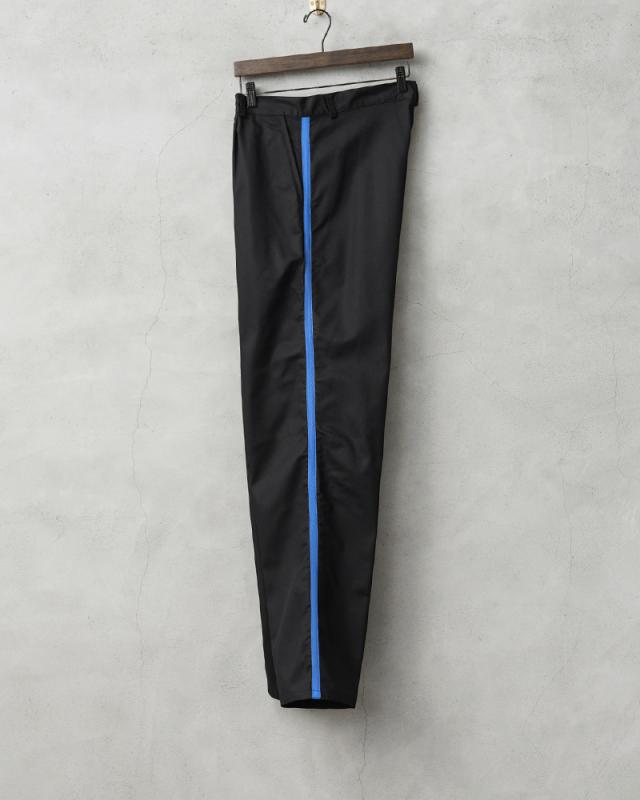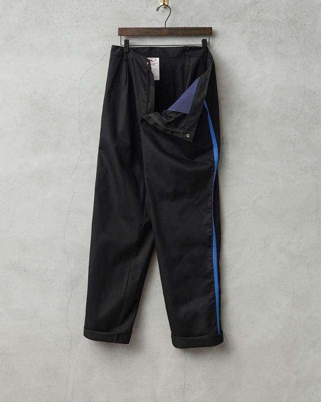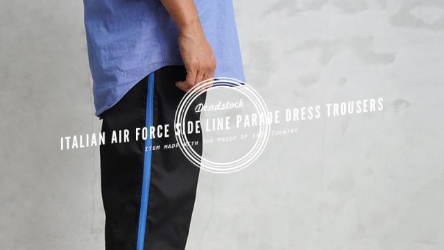 イタリア空軍(Aeronautica Militare Italiana)から放出されたドレストラウザーズが入荷しました。軍事パレードや式典等の制服として使用されるサイドラインパンツで、ブラックカラーにブルーのラインが入れられる事で、上品な中にカジュアルな雰囲気も感じさせ、スタイリッシュな着こなしができる、イタリアらしさを感じさせるパンツです。サイドには左右にスラッシュポケットが備わっていて、バックポケットは右側に1箇所のシンプルなデザイン。使いやすいブラックにブルーのラインが絶妙なアクセントになっています。ドレスからカジュアルまで幅広くスタイリングが楽しめる希少なイタリア空軍のトラウザーズです。
