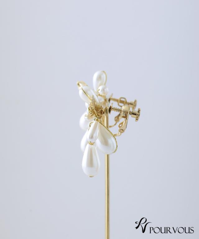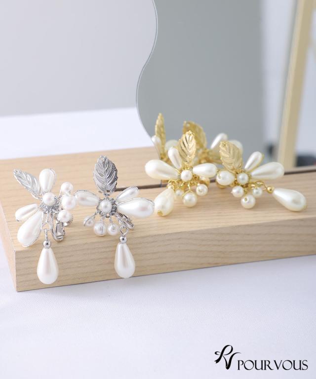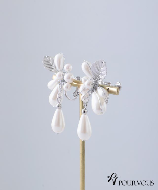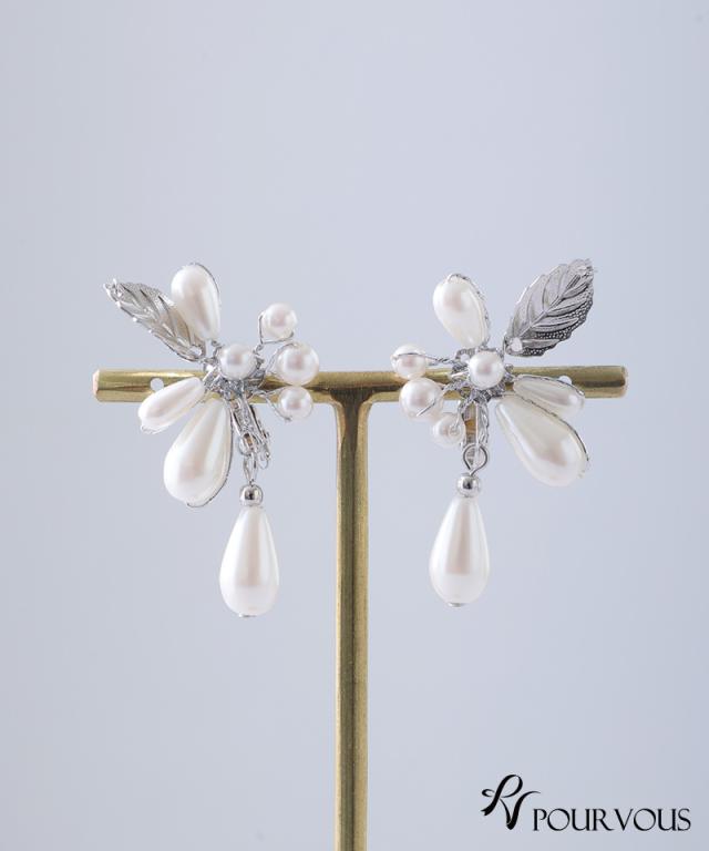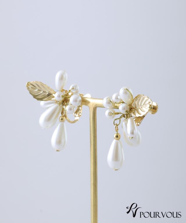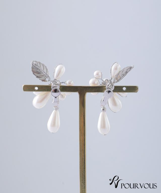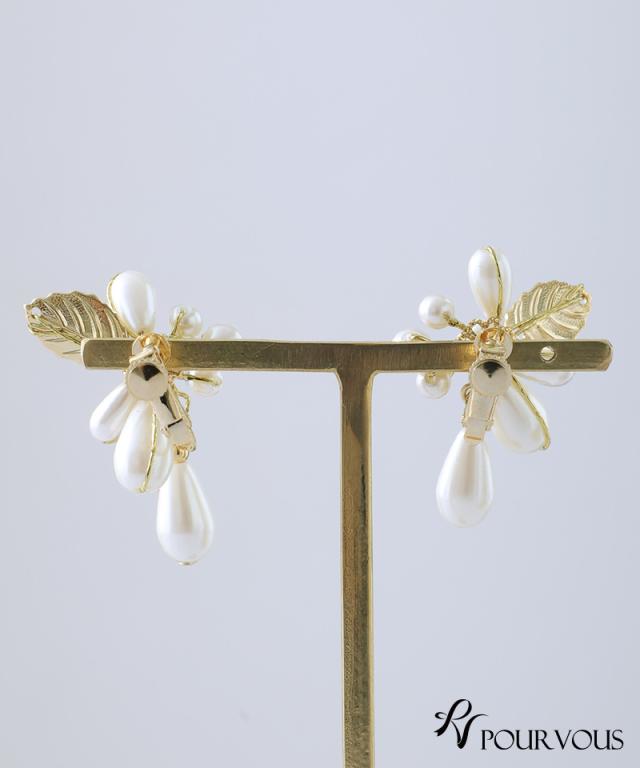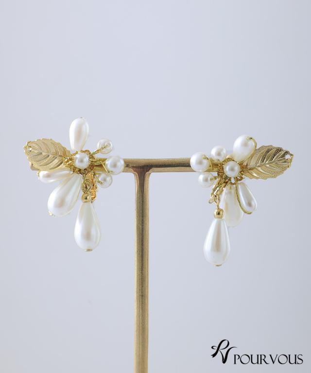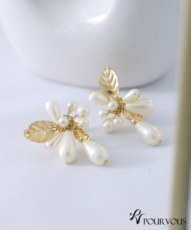 ■リーフモチーフとしずく型のパールが可愛いイヤリング