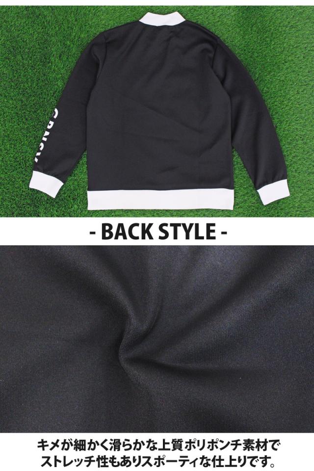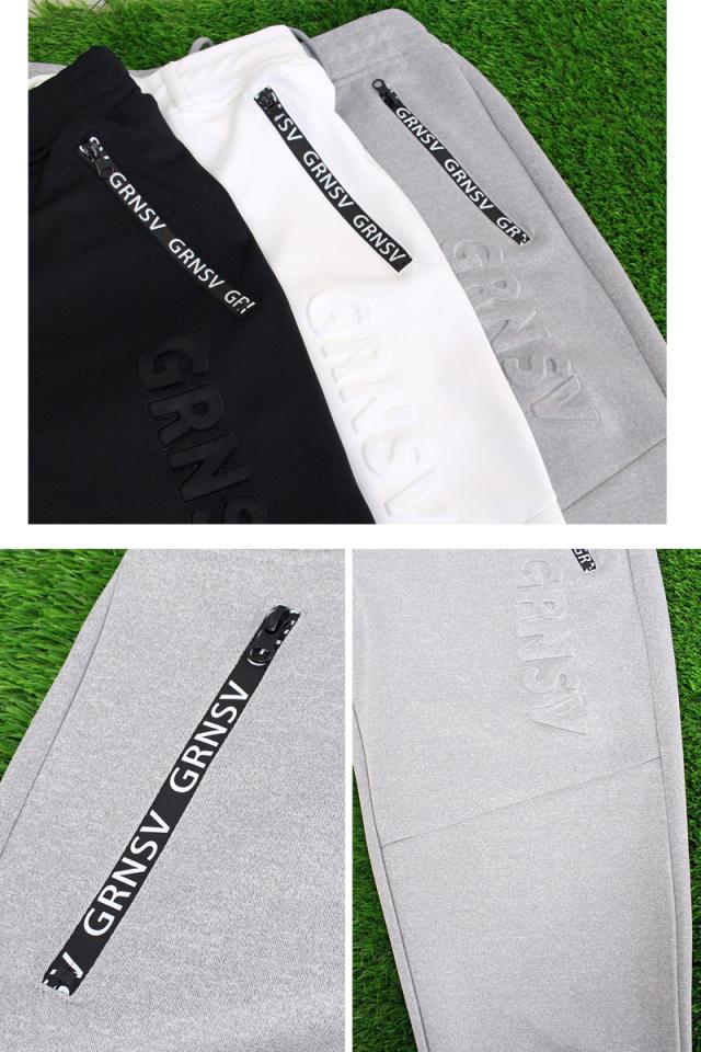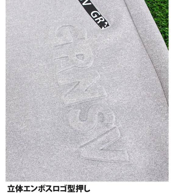 胸元に立体エンボスロゴが入り、袖にもロゴプリント入りのモックネックトレーナーと立体エンボスロゴ入りのゴルフパンツの上下セットアップ。