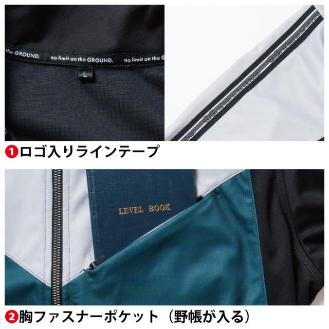 ◇機能:ロゴ入りラインテープ・胸ファスナーポケット(野帳が入る)・袖ペン差し・反射ロゴネーム・反射ロゴプリント・反射プリント・袖口部分リブ