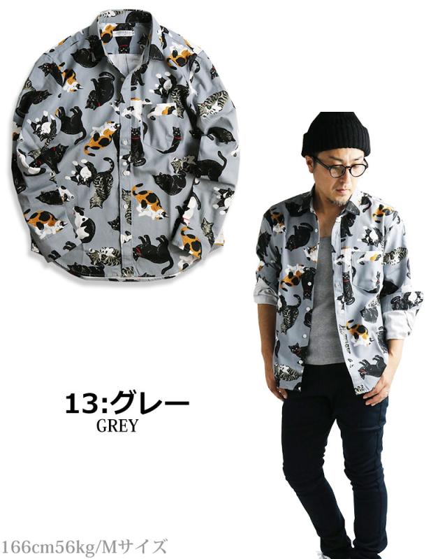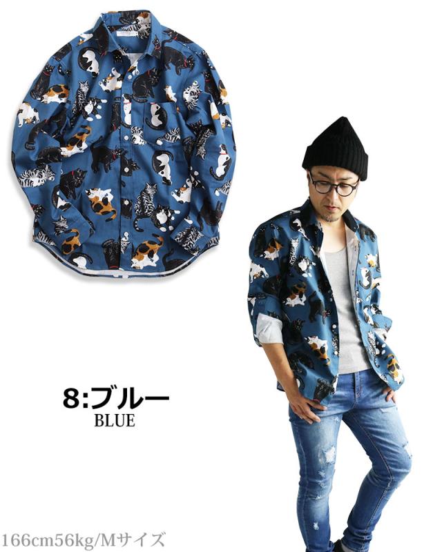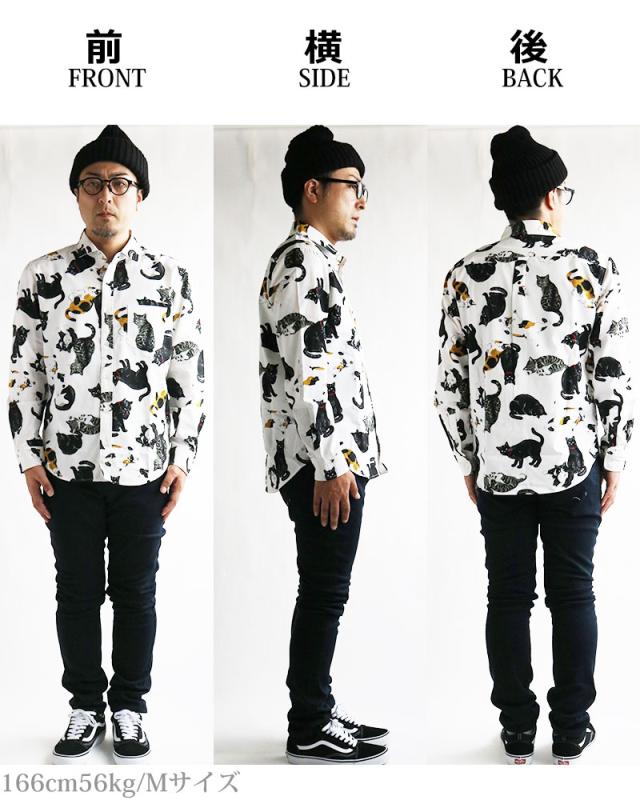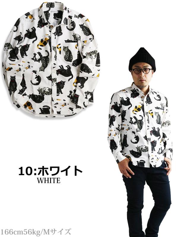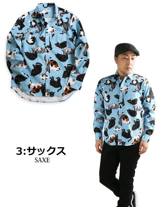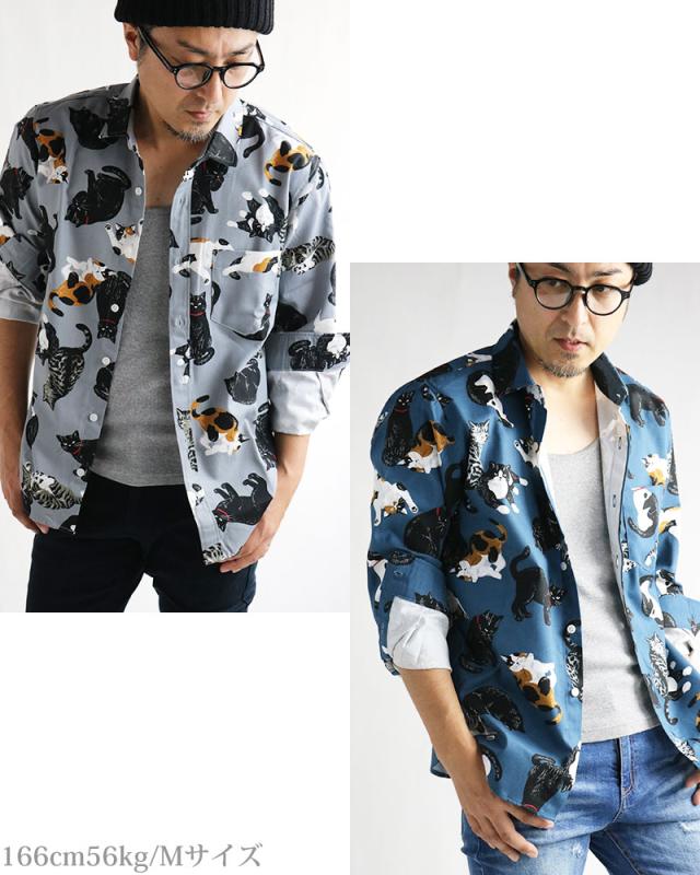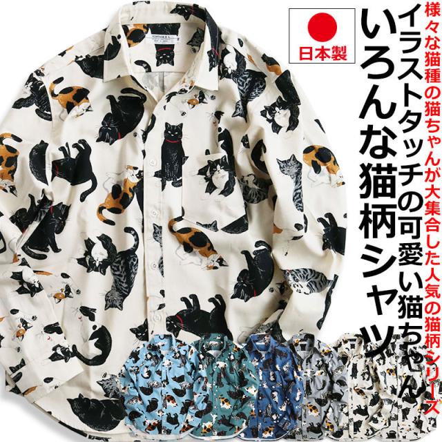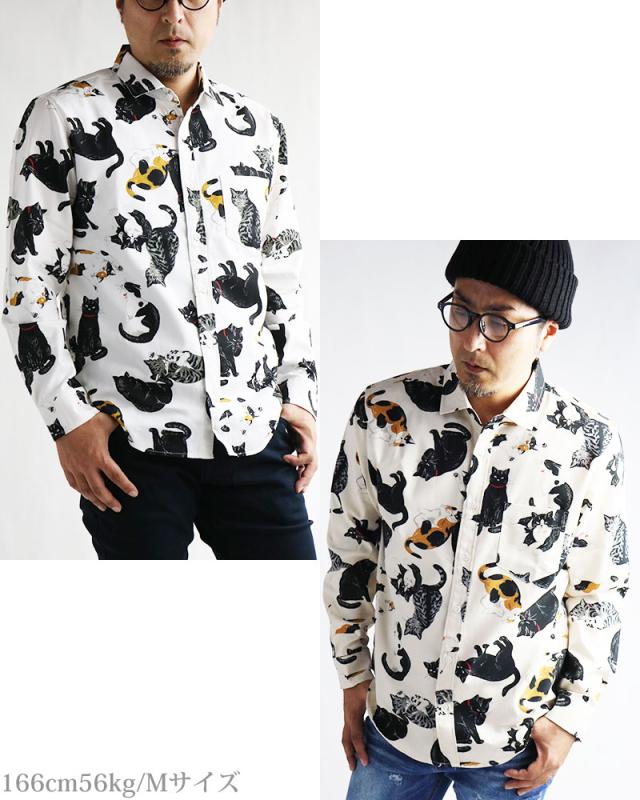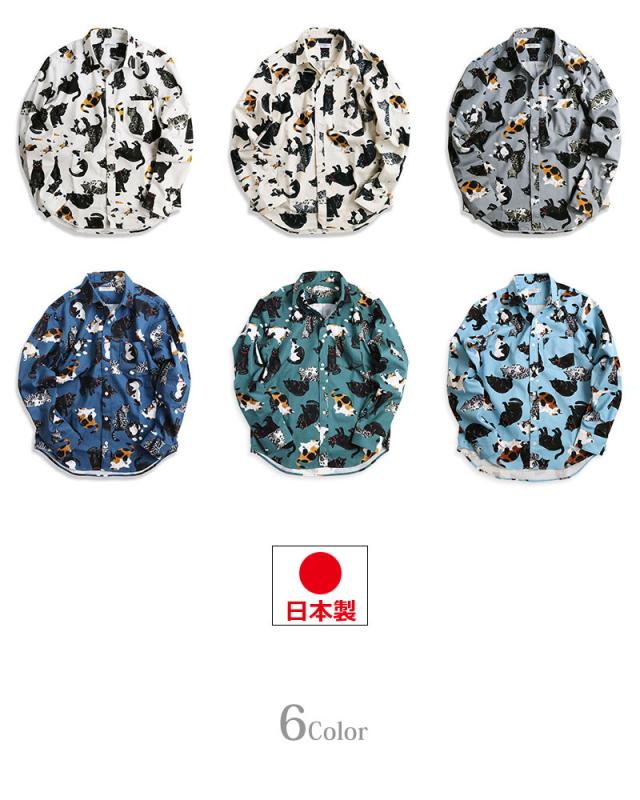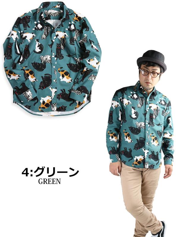 日本製 VINTAGE EL 長袖シャツ メンズ 猫柄 シャツ 柄シャツ ねこ ネコ アニマル 動物柄 日本製 にゃんこ