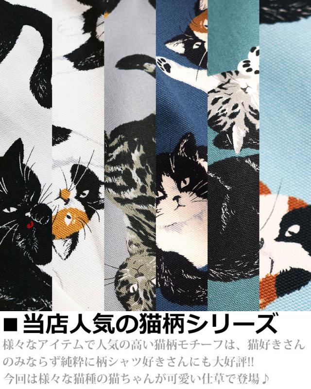 元気いっぱい猫ちゃんだらけながらオシャレな配置で全面に配したキャッチーなネコちゃん柄シャツ
