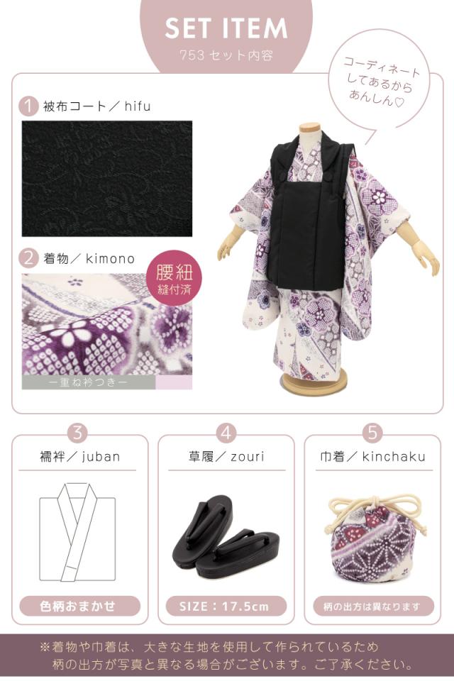 七五三 着物 3歳 販売 女の子 三歳 着物セット 被布セット ブラック系 黒 紫 パープル系 白 絞り調 熨斗 牡丹 花柄 ボヌールセゾン 被布着 きもの 和服 和装 女児 子供 送料無料