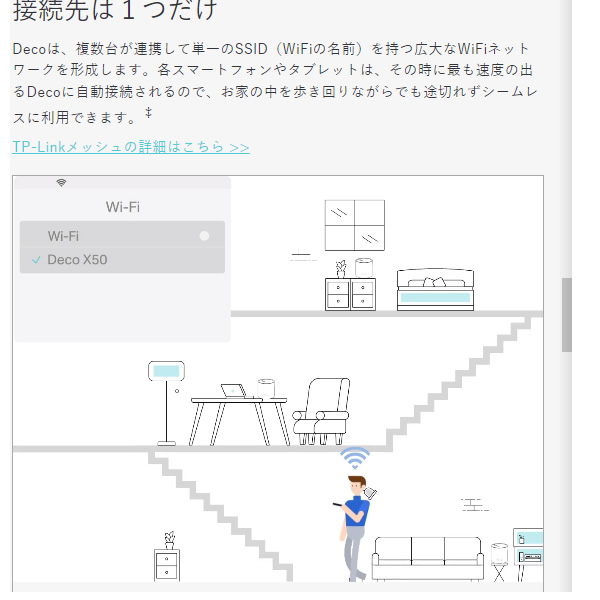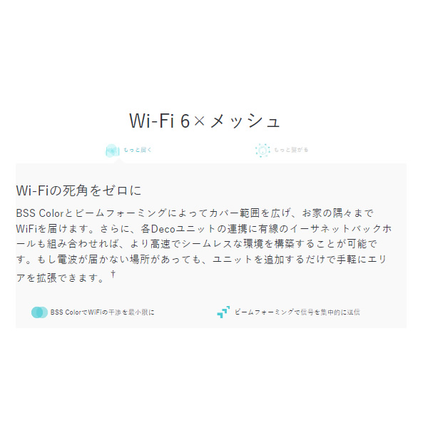 高速Wi-Fiでお家を塗りつぶそう ■無線LAN仕様 規格:Wi-Fi 6 IEEE 802.11ax/ac/n/a(5GHz)、IEEE 802.11ax/n/b/g(2.4GHz) Wi-Fi速度:AX3000 5GHz:2402Mbps(802.11ax, HE160)、2.4GHz:574Mbps(802.11ax) Wi-Fi範囲:1〜3LDK Wi-Fi性能:デュアルバンド、2×2 MU-MIMO、OFDMA、4ストリーム 動作モード:ルーターモード、ブリッジモード ■寸法 (W×D×H):110×110×114mm ■パッケージ内容:Deco X50ユニット×1、RJ45 LANケーブル×1、電源アダプター×1、かんたん設定ガイド ■システム要件:Android 4.4以降、iOS 9.0以降 ■動作環境 動作温度:0°C〜40°C(32°F〜104°F) 保存温度:-40°C〜70°C(-40°F〜158°F) 動作湿度:10%〜90%(結露を避けてください) 保存湿度:5%〜90%(結露を避けてください) ※記載は商品仕様の一部です。仕様説明不足等の理由での返品はできません。特に適合等は必ずご確認ください。