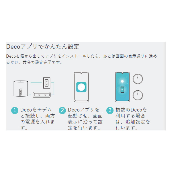 ■パッケージ内容:Deco X50ユニット×1、RJ45 LANケーブル×1、電源アダプター×1、かんたん設定ガイド