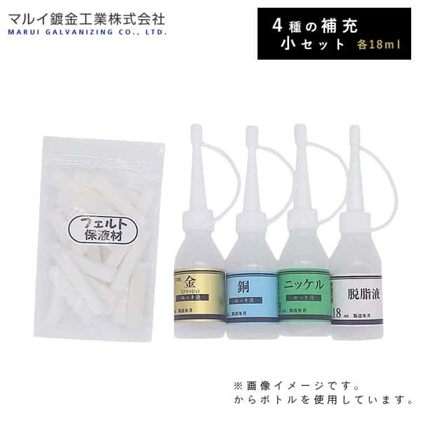 マルイ鍍金工業 めっき工房用 補充液セットA MF-A L600157F 脱脂液 銅めっき液 ニッケルめっき液 金めっき液 フェルト保液材 メッキ液 DIY 塗料 代引不可