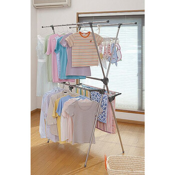1.伸縮機構の採用(高さ・干し部)によりコンパクトな1段使用から大容量2段使用まで洗濯物の量に合わせて使い分けができます。