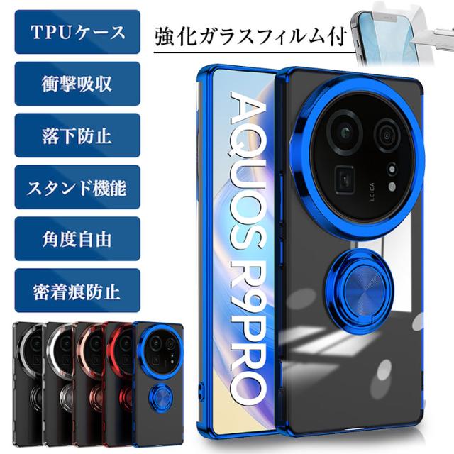 ガラスフィルムセット AQUOS R10 R9 Pro R9 R8 R8proドコモ SH-52D SH-51D ソフトバンク アクオス アールナイン アールエイト アールエイトプロ ケース docomo SoftBank カバー サイドメッキ ソフト メタリック クリア 360度回転バンカーリング付きスマホケース