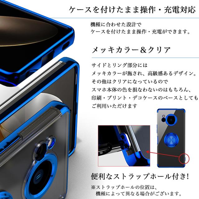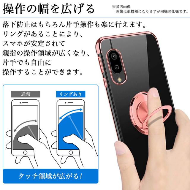 ■TPU素材のソフトケースで耐衝撃性 TPU素材を採用したケースは、柔軟性があり着脱が楽々。衝撃にも強い素材の為、万が一落としてしまってもスマホを守ります。 ■360°回転可能、スタンドにもなるリング付き フィンガ(バンカー)ーリングは、操作中の落下を防ぎ、端末が持ち易くなり、片手操作が楽になります。鉄素材なのでマグネット式ホルダーに付けて使用可能。 またスタンド機能としても活躍し、動画視聴やムービー撮影に最適です。 ■ケースを付けたまま充電・操作可能 ロックボタンや音量ボタン・充電などケースを付けたままお使いいただけます。 ■メッキカラー&クリア サイドとリング部分にはメッキカラーが施され、高級感あふれるデザイン。 その他はクリアになっているので印刷・プリント・デコケースのベースとしてもご利用いただけます。 便利なストラップホール付きです。 ■指紋・密着痕 防止設計 指紋防止コーティングになっており、指紋や汚れがつきにくい設計。手触りも良く使いやすいです。 ケース内側部分には密着痕防止のマイクロドット加工が施してあり、端末にケースが張り付くのを防止します。 ※ストラップホールの位置は機種によって異なる場合がございます。 ※完全なクリアケースをお求めの方はご注意ください。 |