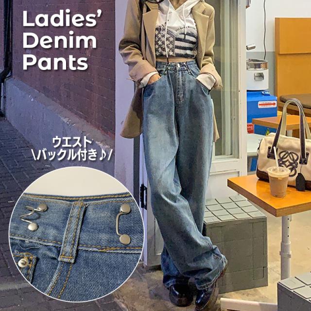 デニムパンツ ワイドパンツ バギージーンズ バギーパンツ ウエストバックル付き レディース ボトムス ジーンズ ジーパン 長ズボ