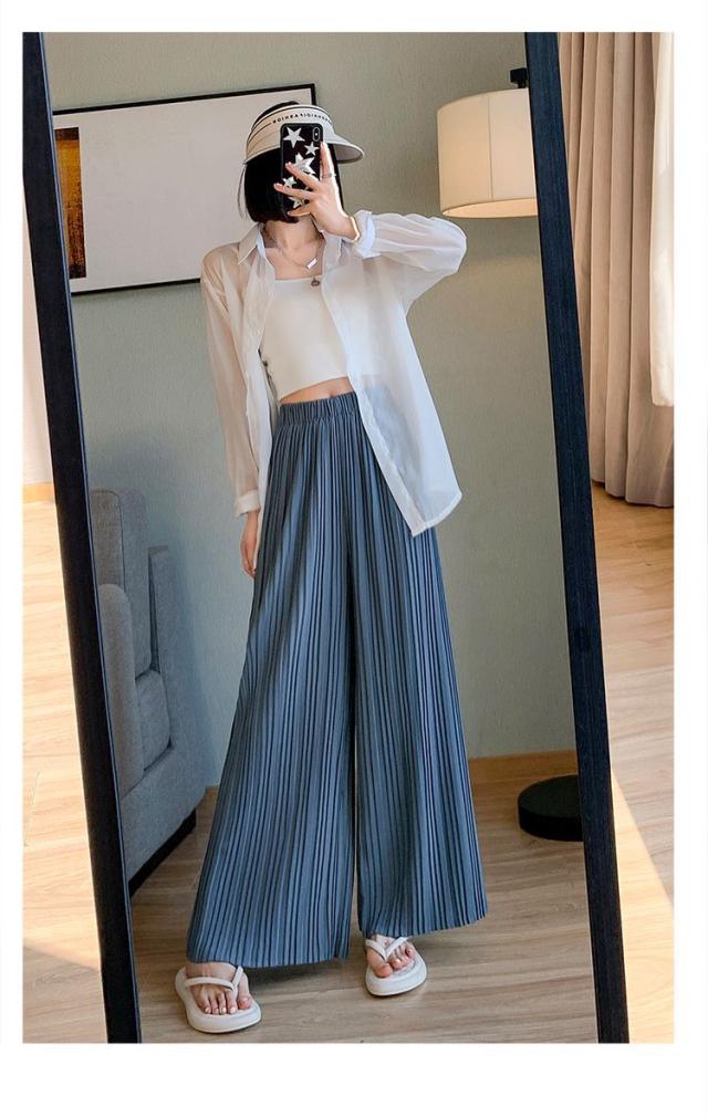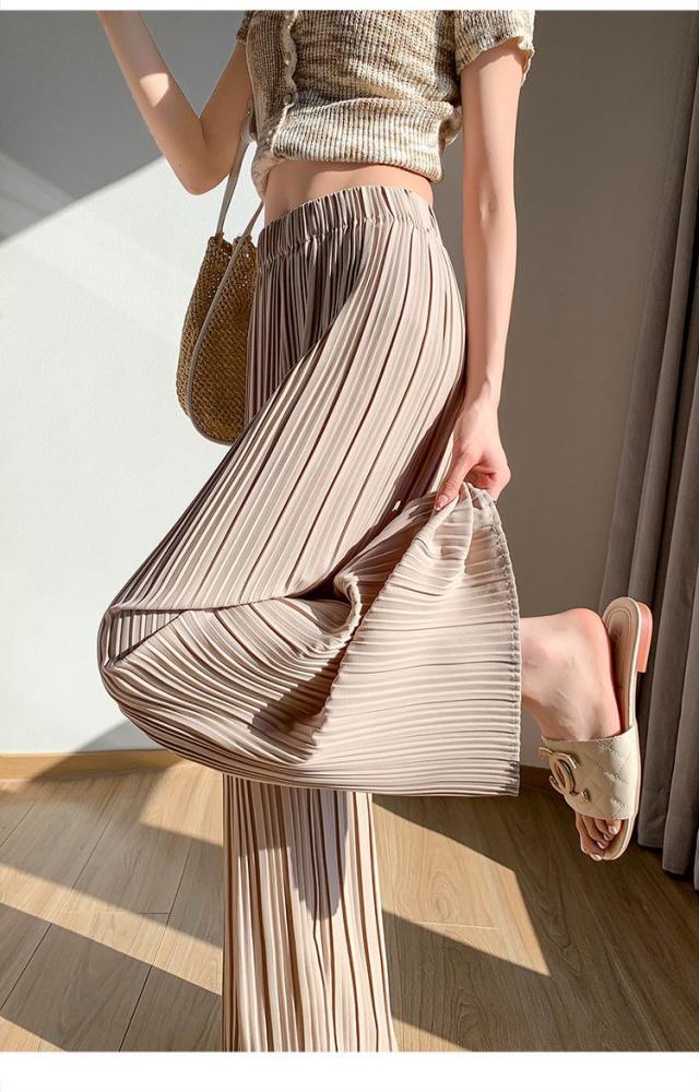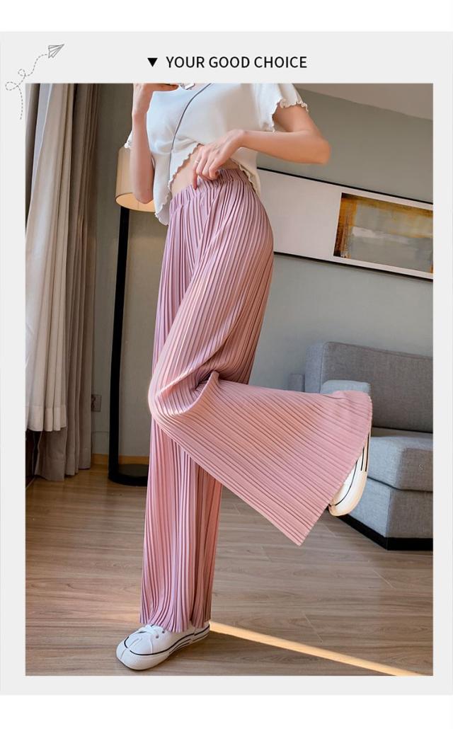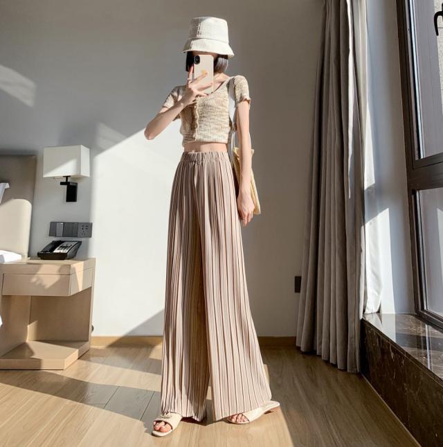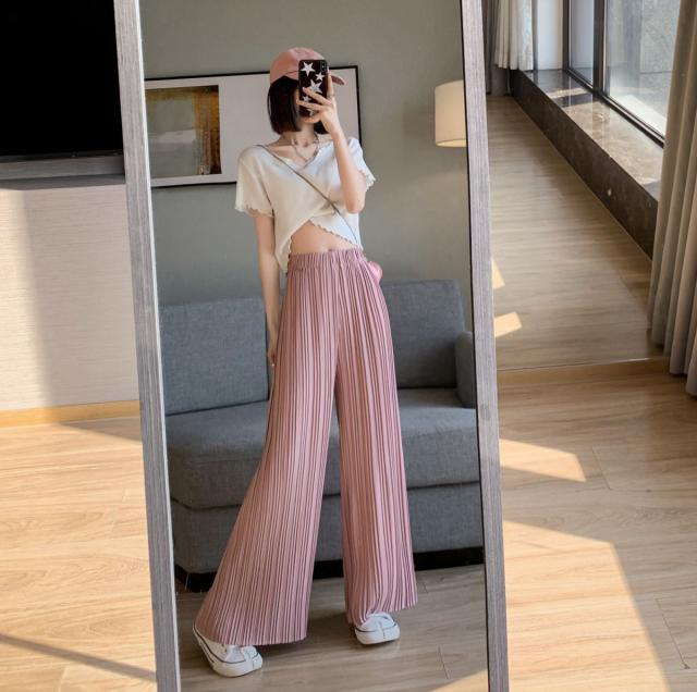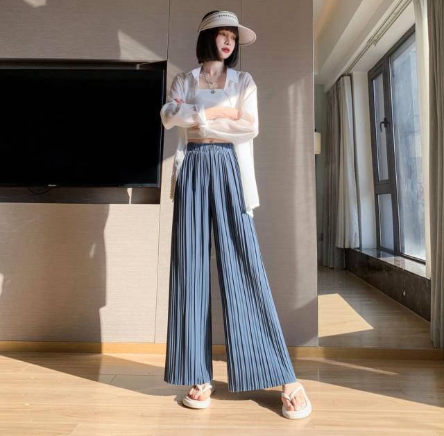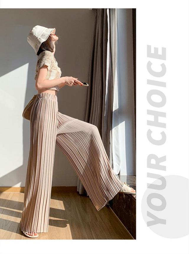サラッと涼しく夏プリーツパンツ 無地 プリーツ ワイド ルーズ ロングパンツ 4カラー プリーツパンツ 柔らか素材 ウエストゴム 美脚見え ストレートシルエット