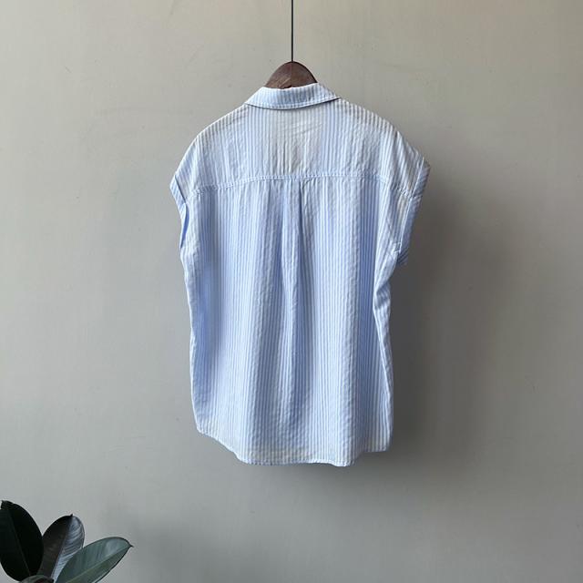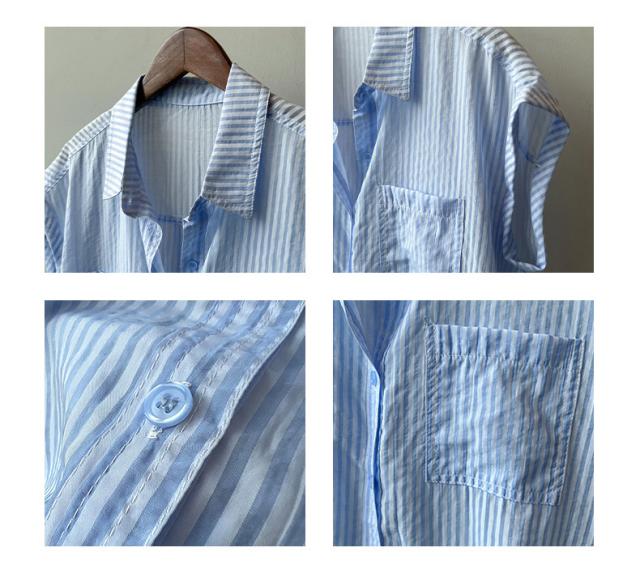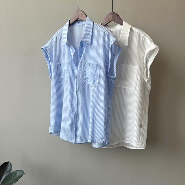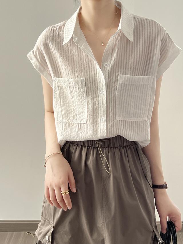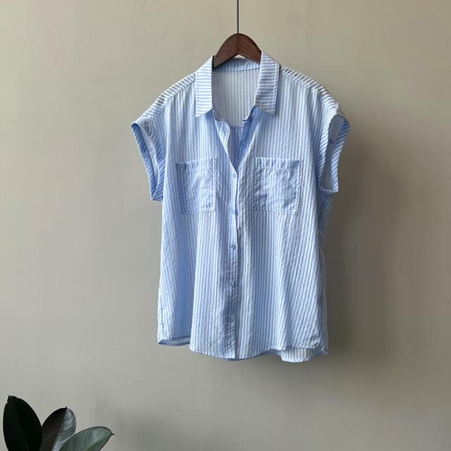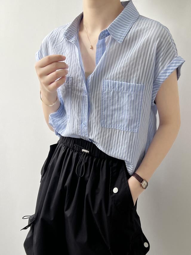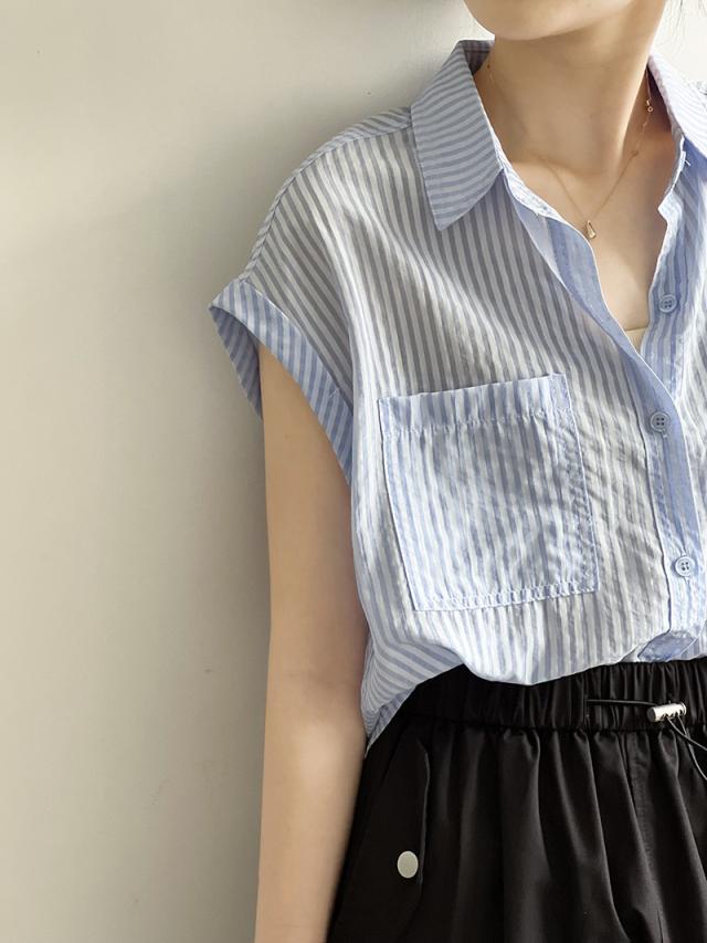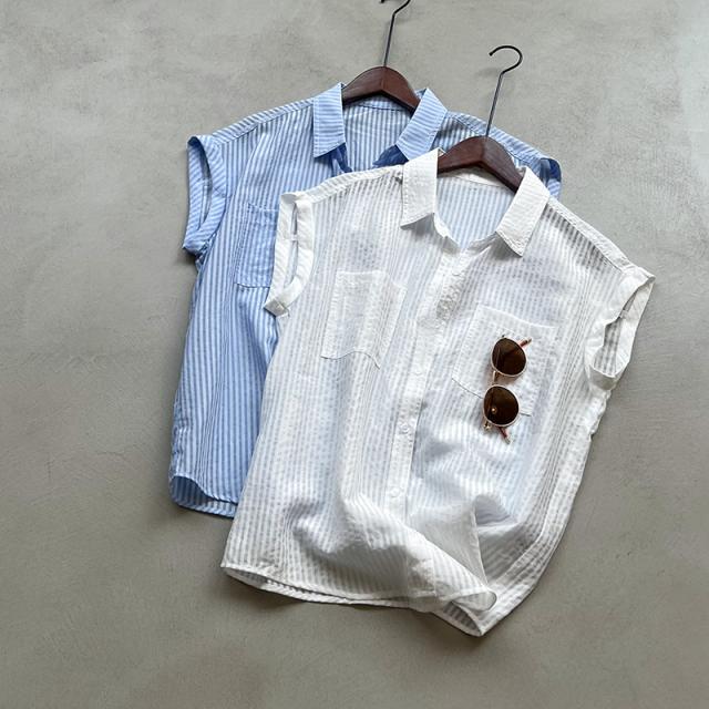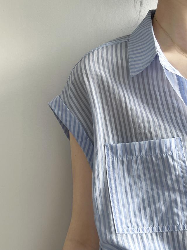 シャツブラウス レディース 半袖 フレンチスリーブ ブラウス 夏 ストライプ柄 無地 前開き トップス チュニック ブラウス シャツ ノースリ ゆったり きれいめ ブラウスシャツ