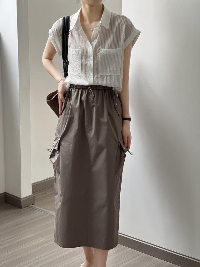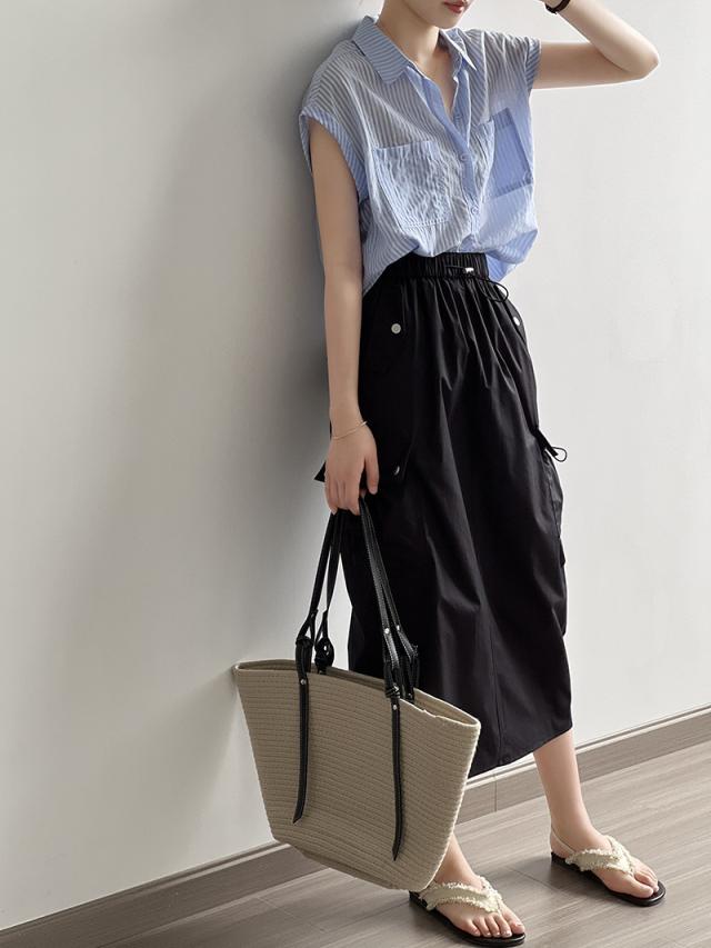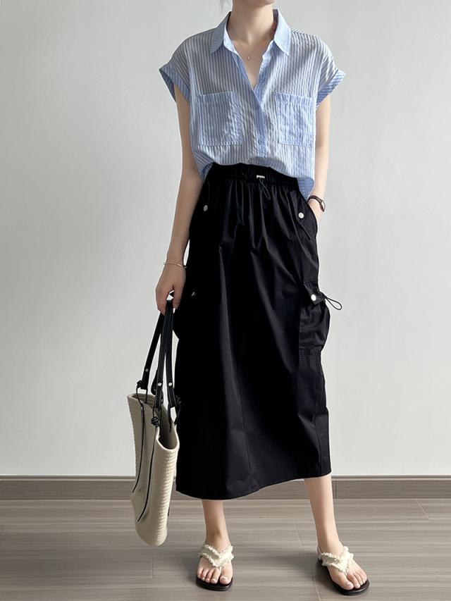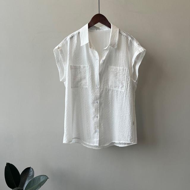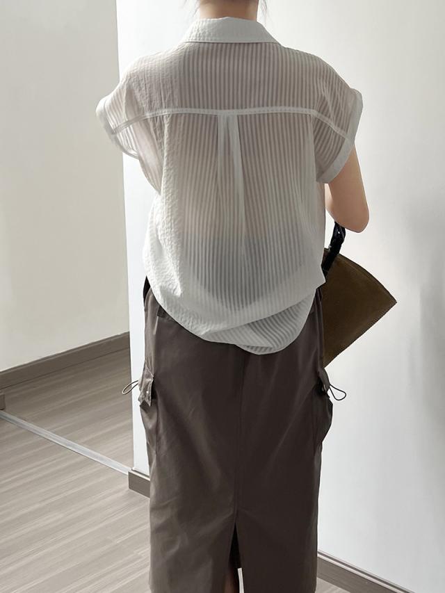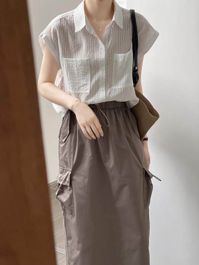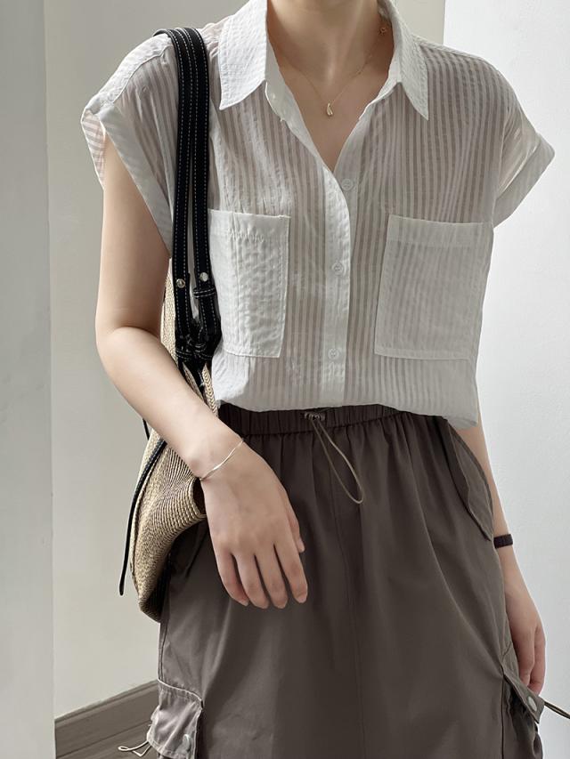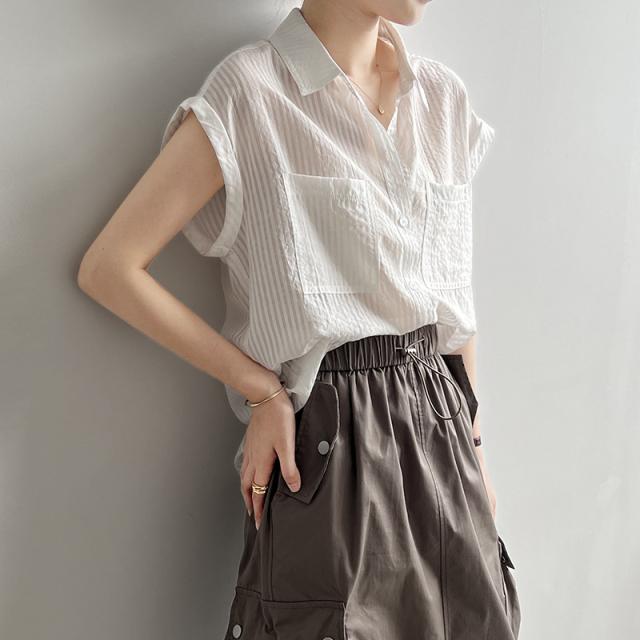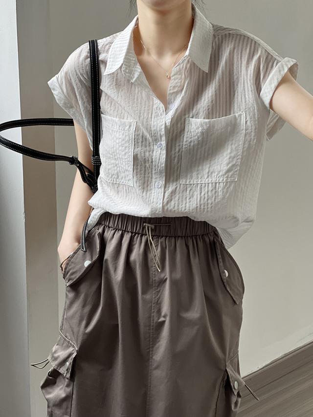 シャツブラウス レディース 半袖 フレンチスリーブ ブラウス 夏 ストライプ柄 無地 前開き トップス チュニック ブラウス シャツ ノースリ ゆったり きれいめ ブラウスシャツ