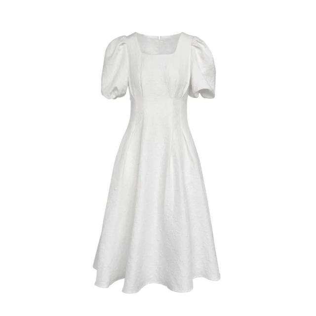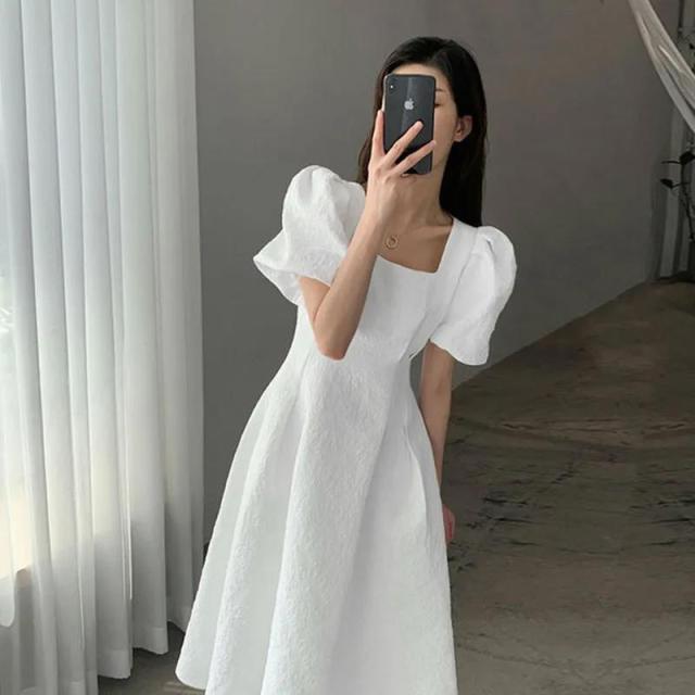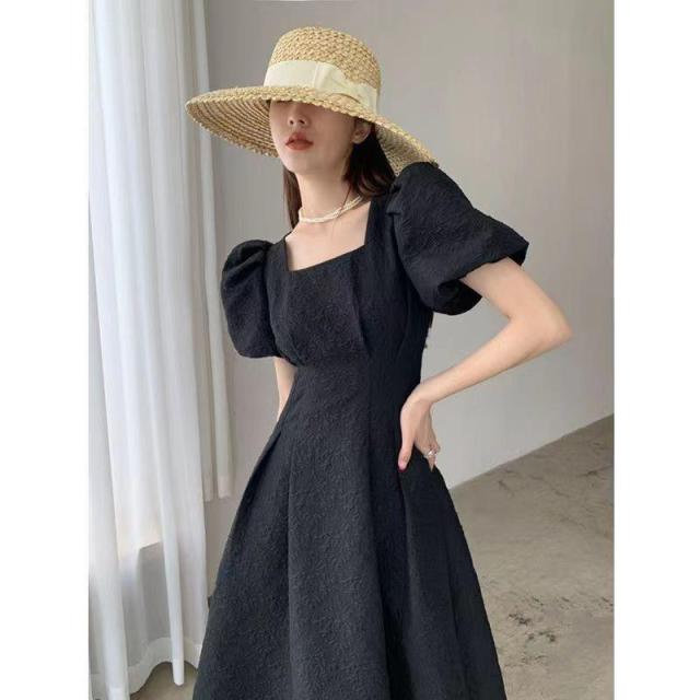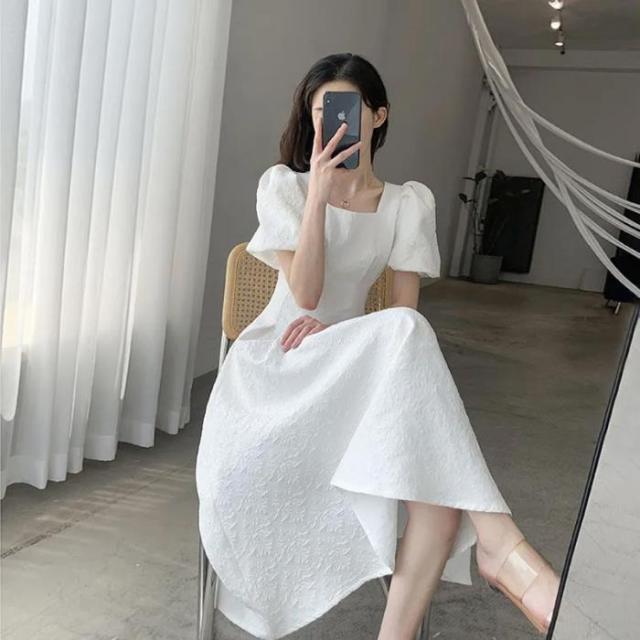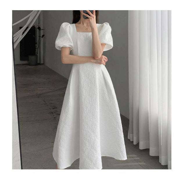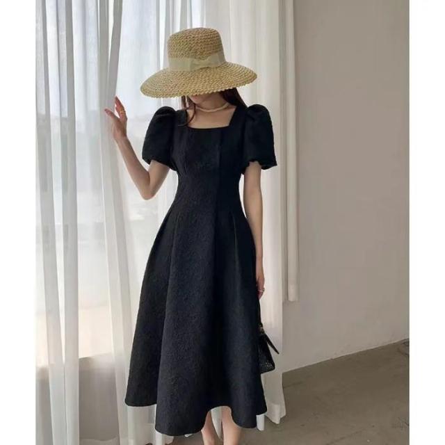 ロングワンピース パフスリーブ スクエアネック 半袖ワンピース ボリュームスリーブ 細見え 体型カバー 二の腕ほっそり シンプル ブラック ホワイト