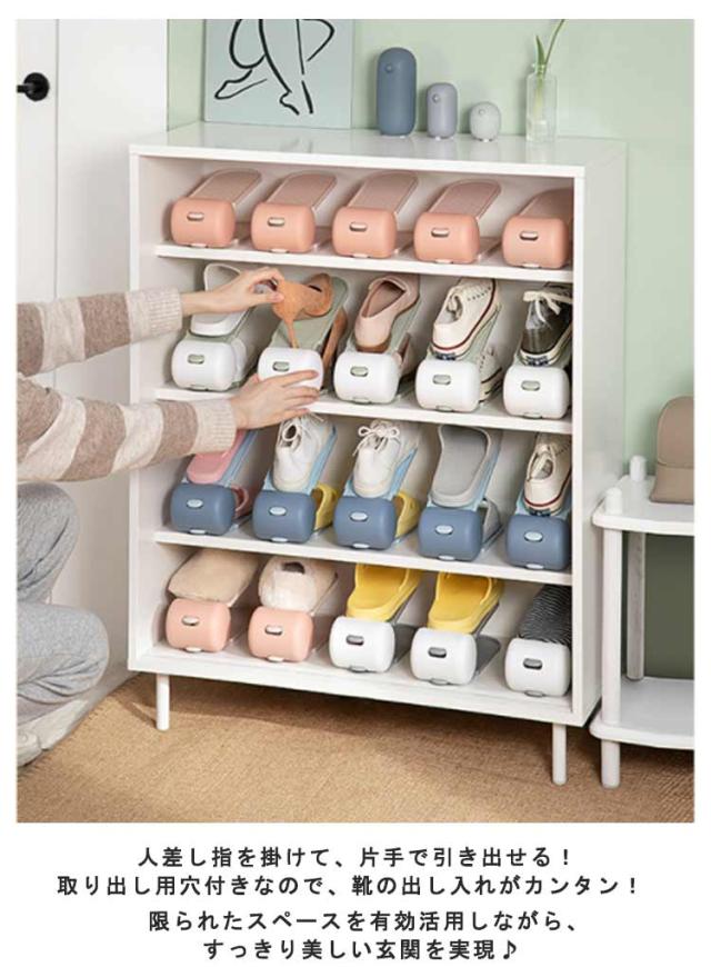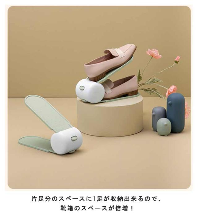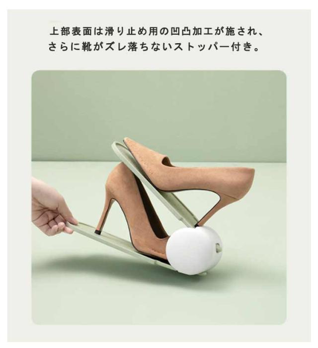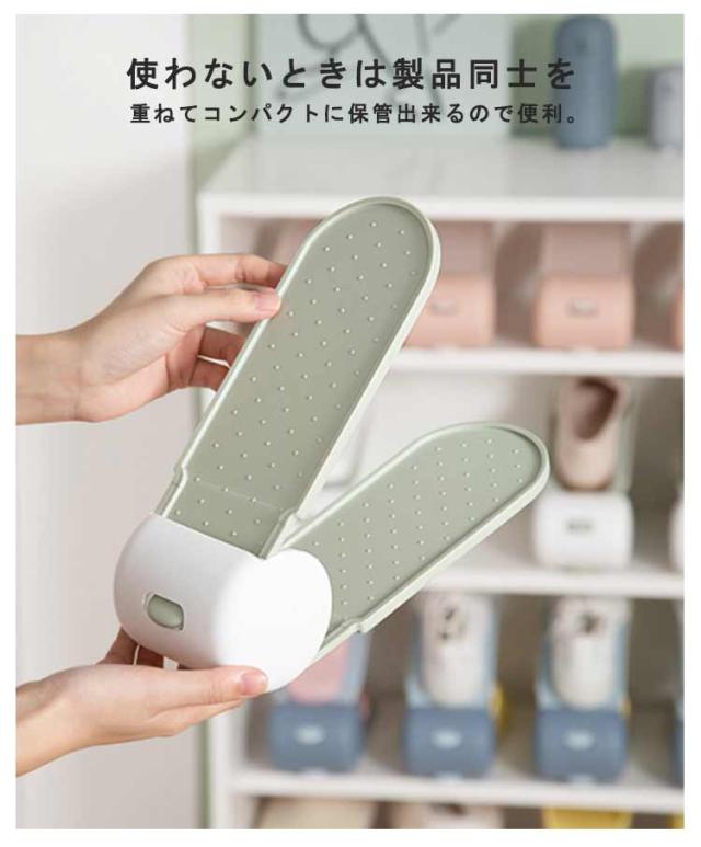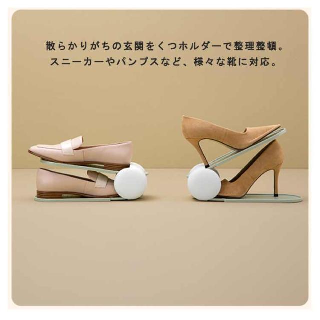 | 下駄箱内の収納力が2倍にアップするスリム靴ホルダー。 靴ホルダーを使うと1足のスペースで2足の収納ができるので、下駄箱のスペースを最大限に有効活用できます。 玄関周りをすっきりと片付けたい方におすすめです。 幅の狭いスリムタイプなので、パンプスやサンダルなどの細身の靴をデットスペースを作ることなく、収納できます。 靴の厚さやかかとの高さに合わせて、2段階に角度調節が可能です。 引き出し用の穴がついており、片手でさっと取り出せます。 一般的な箱型のシューズボックスと異なり一目で確認できて、目的の靴をサッと取り出せるのも嬉しいポイント。 男性用・女性用ともに使えるサイズなので、ご家族皆さんで使ってもOK。 | |