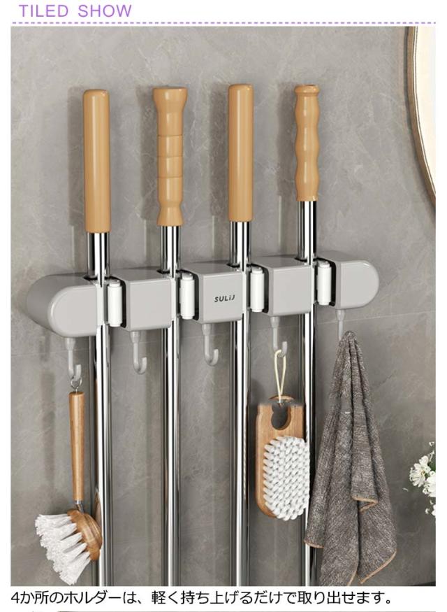 | 【4つホルダー】5つフック付き!マルチ用途可能なモップホルダー。 4か所のホルダーは、軽く持ち上げるだけで取り出せます。 軽く押すだけでしっかりと挟みます・柔らかいシリコン製で、簡単に留められます。 多様な収納方法で、釘や穴を開け不要。 強力な耐荷重、多数のフック搭載! 使用前は乱雑だったものが、使用後は整理整頓されます。 バルコニー収納、キッチン収納、バスルーム収納、トイレ収納! 取付方法:付属ホルダーを壁面へ粘着貼り付け※掃除の時など本体の取り外しが可能! | |