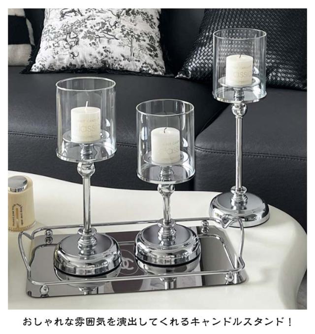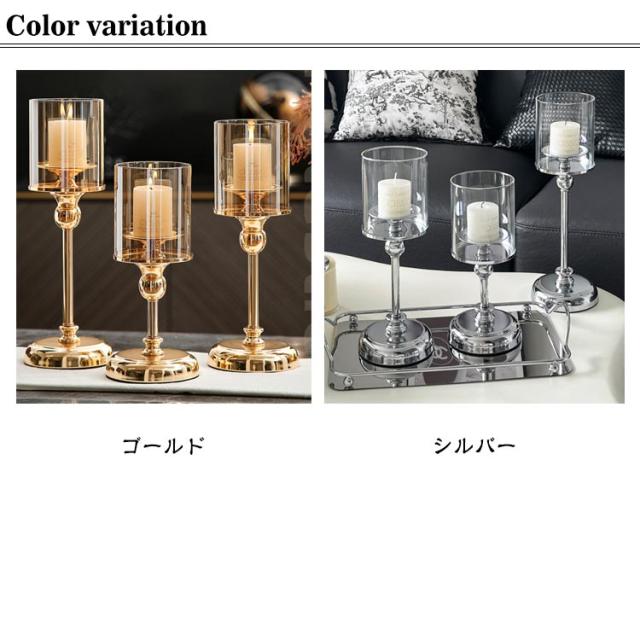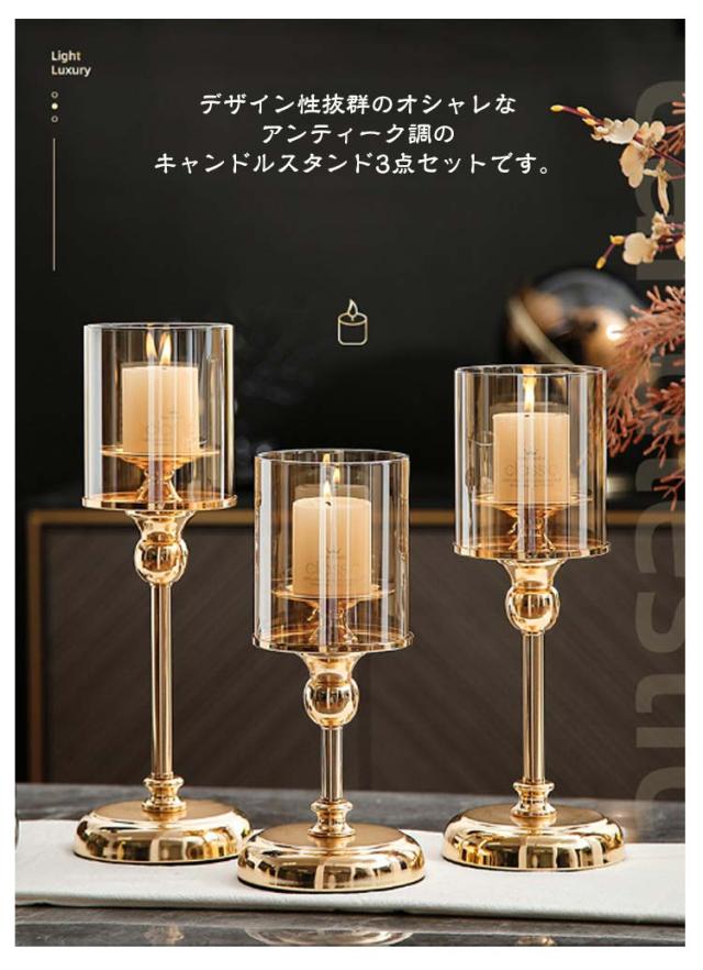 | 【キャンドルスタンド・3点セット】【2color】 デザイン性抜群のオシャレなアンティーク調のキャンドルスタンド3点セットです。 キャンドルホルダーとしては勿論のことオブジェとしてお部屋にそのまま飾るだけでおしゃれなインテリアになります。 透き通ったガラスシェードから暖かなキャンドルのあかり。 明かりは広がりすぎないので、とても優しくほのかに照らしてくれます。 リラックスタイムのお供にどうぞ。並べて飾っても素敵ですよ。 おしゃれな雰囲気を演出してくれるキャンドルスタンド! エレガントなデザインで癒しの空間をどうぞ! | |