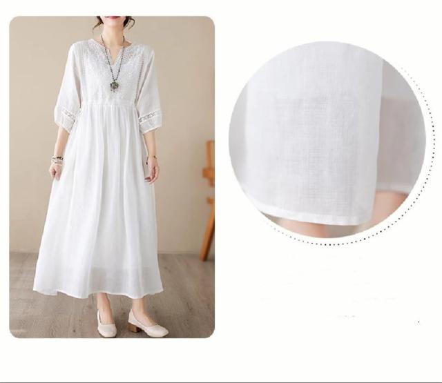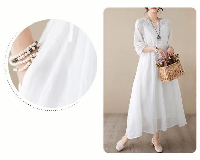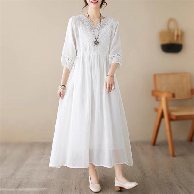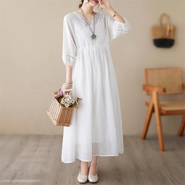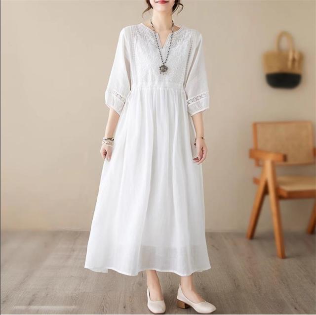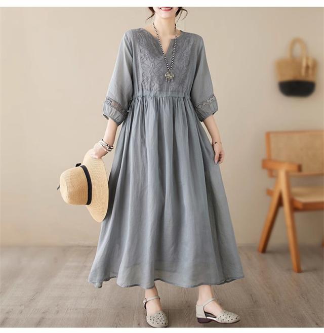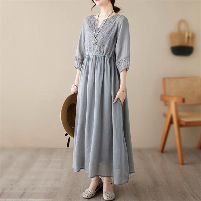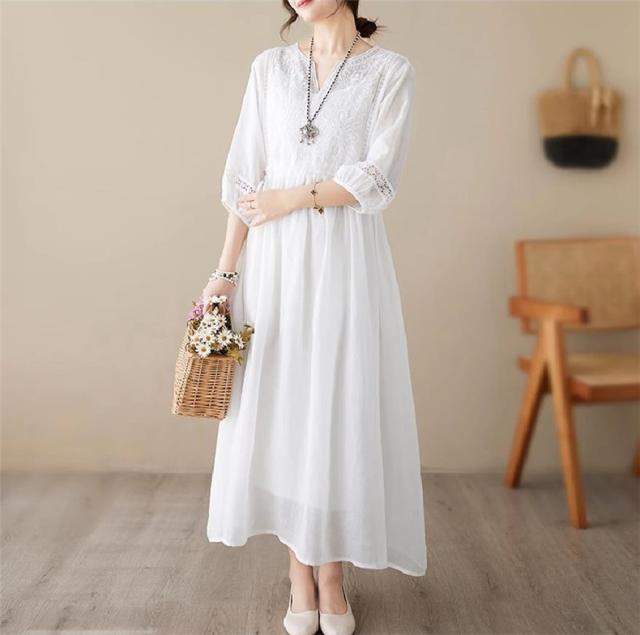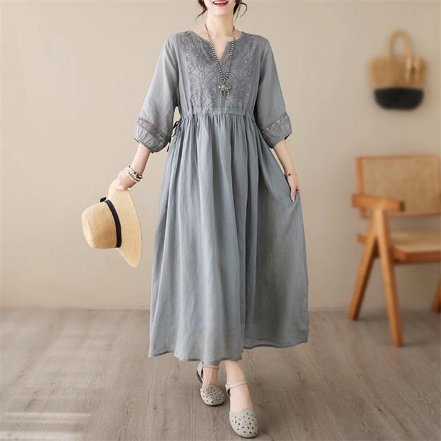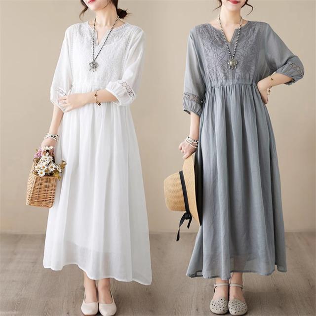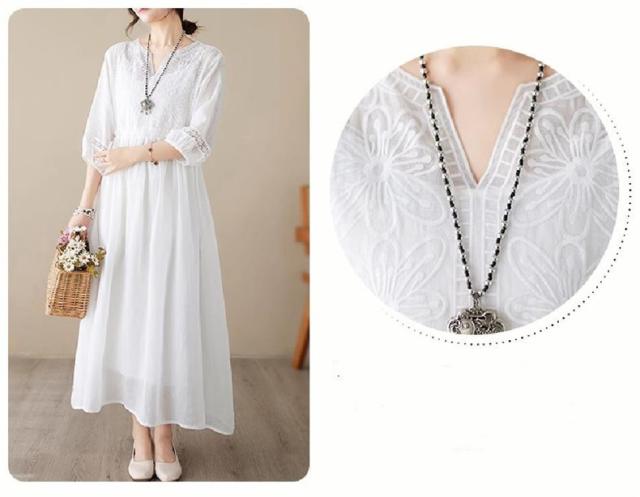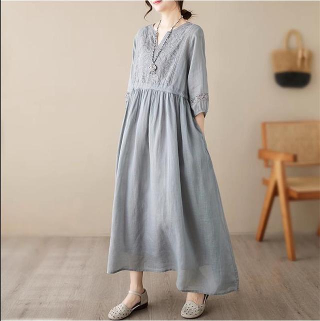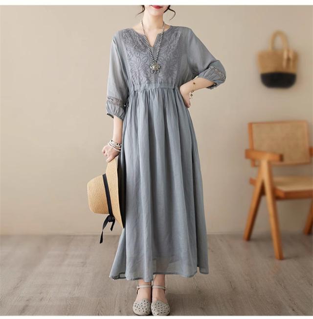 シャツワンピース レディーズ 襟刺繍 サマーワンピース 無地 ロングワンピース 着やせ 自然に体型カバー 大人可愛い 軽くてしなやかさもある 落ち着いた印象