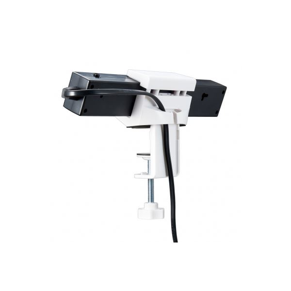 お手持ちのタップを挟んで机や棚に固定でき、抜き差しが便利