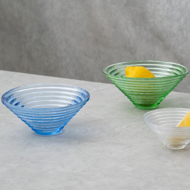 スピン製法というガラスのタネを遠心力によってひろげる技法が用いられています。ガラス本来の魅力でもある伸びやかで柔らかなフォルムです。