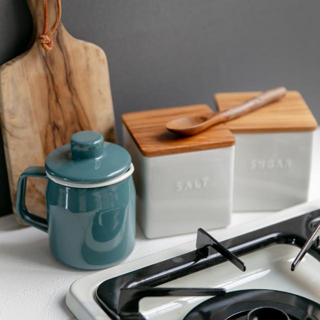 コンロの近くに置きっぱなしでも邪魔にならないサイズなので、見せる収納アイテムとして取り入れるのもおすすめ。北欧風のカラーとホーローの優しい雰囲気がキッチンをおしゃれに見せてくれます。