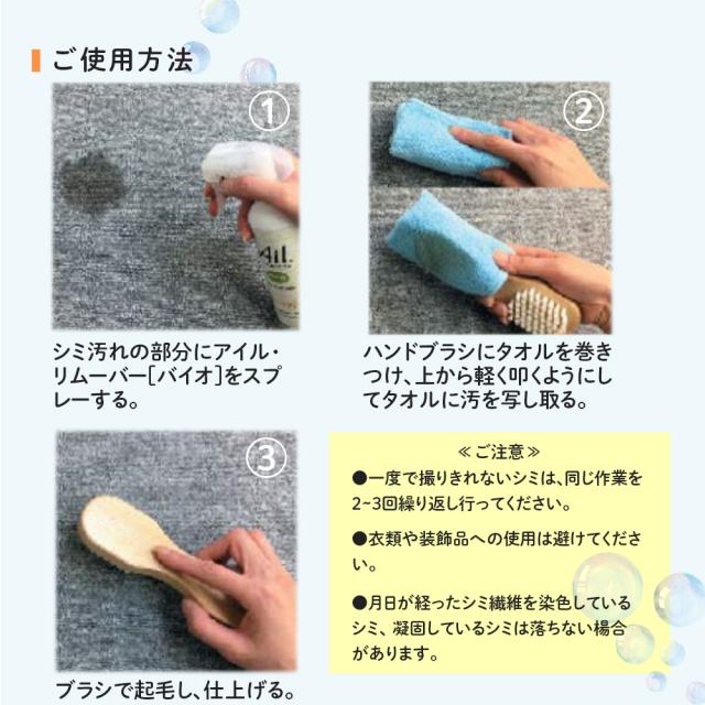 ●アイル・リムーバー[バイオ]は、天然バクテリア主成分のカーペット・布製品のシミ取りクリーナーです。善玉バクテリアがカーペット繊維の奥まで浸透し、コーヒーや血液などの頑固な汚れを無害な「水」と「二酸化炭素」に分解。安全で環境にやさしく、高い洗浄力が期待できます。