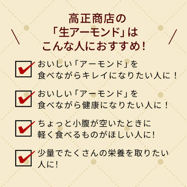 高正商店の「生アーモンド」は、アメリカ産、添加物不使用!食塩不使用!です。自然の甘さをお楽しみください。 アーモンドは、ミネラルのバランスが良く、食物繊維やビタミンE、オレイン酸なども豊富で栄養満点です。 ローストして、おやつやおつまみ、お菓子、パン、お料理の材料としてお使いください!