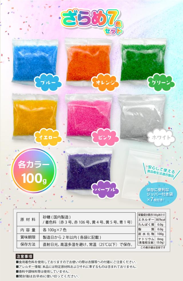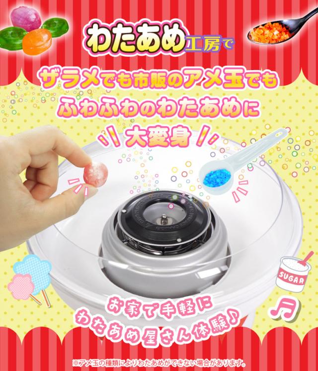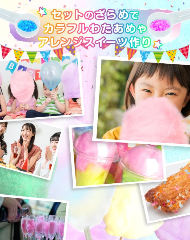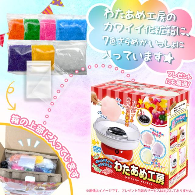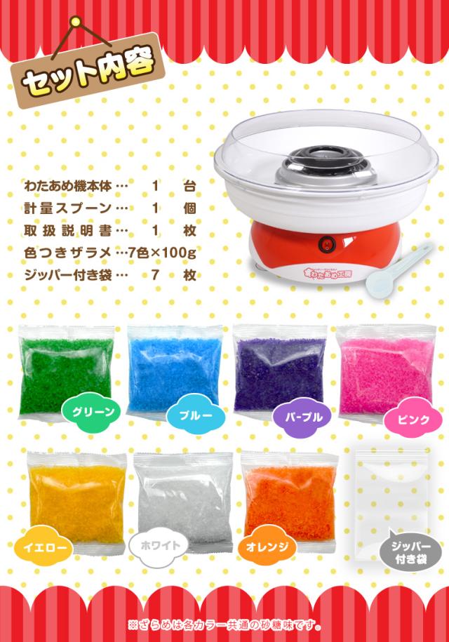 わた菓子が作れる「わたあめ工房」に、色つきざらめ7色がセット。