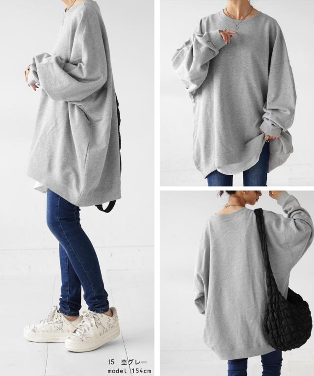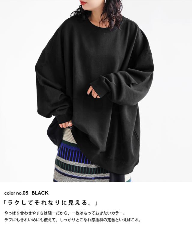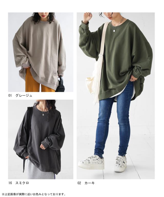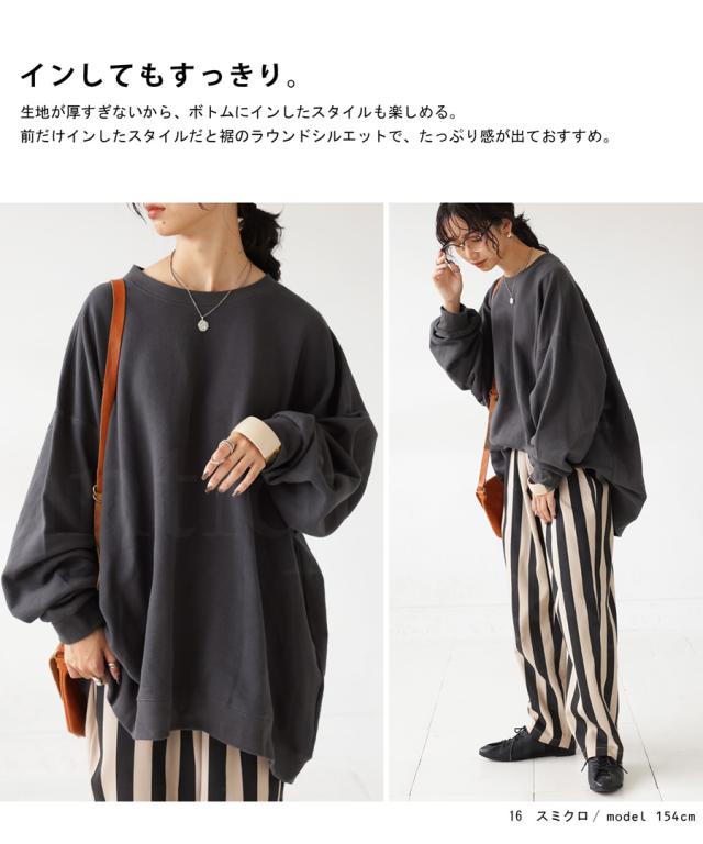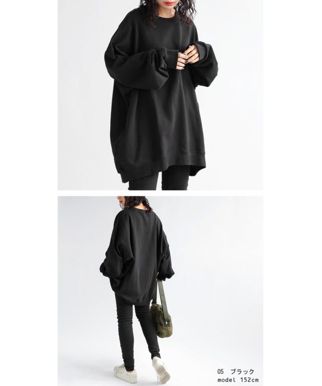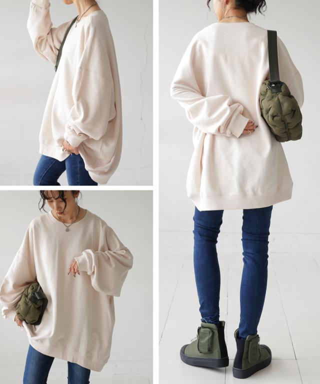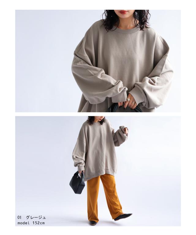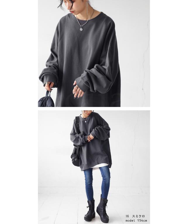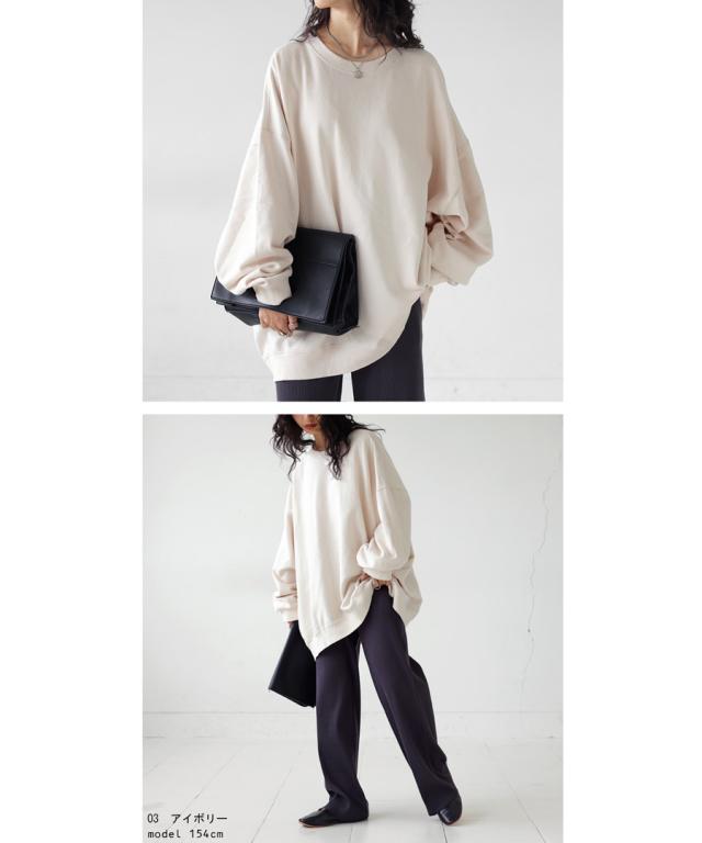 zya-00009 スウェット 無地 シンプル 長袖 クルーネック 丸首 リブ 前後差 ドロップショルダー ゆったり ラフ 裏毛 裏毛トップス ボリューム袖 きれいめ 綿 コットン 着痩せ