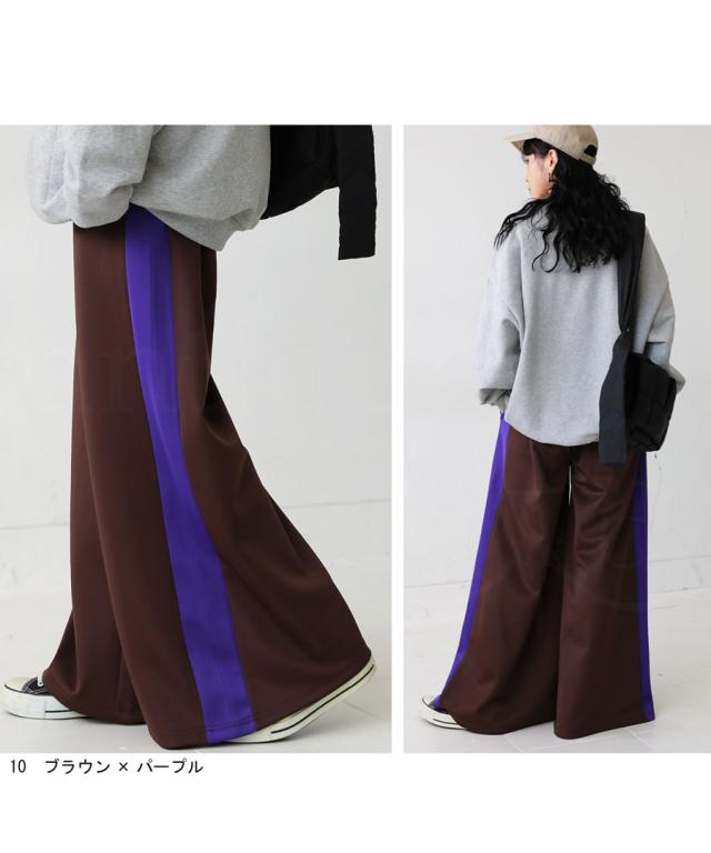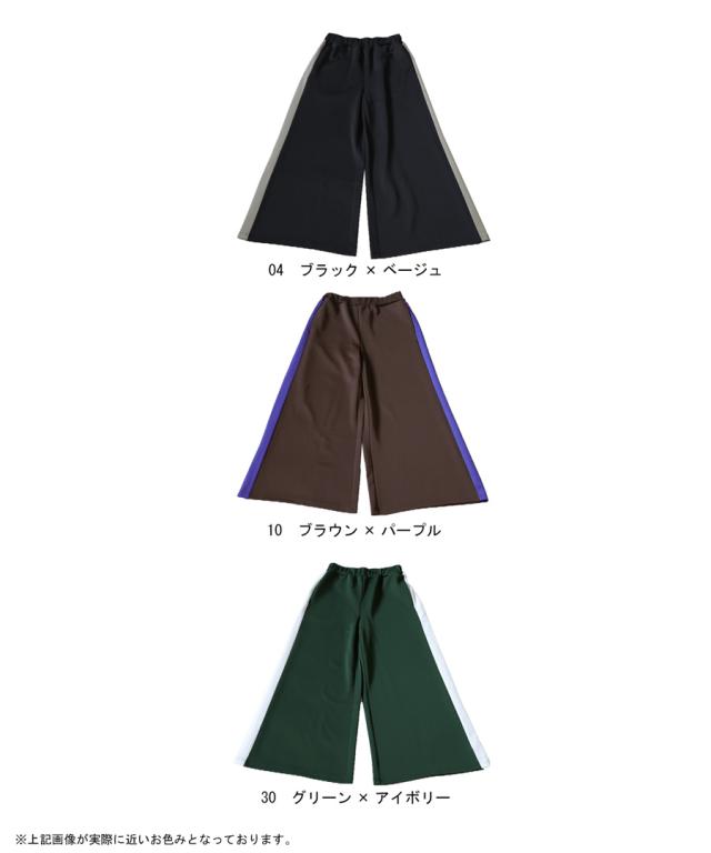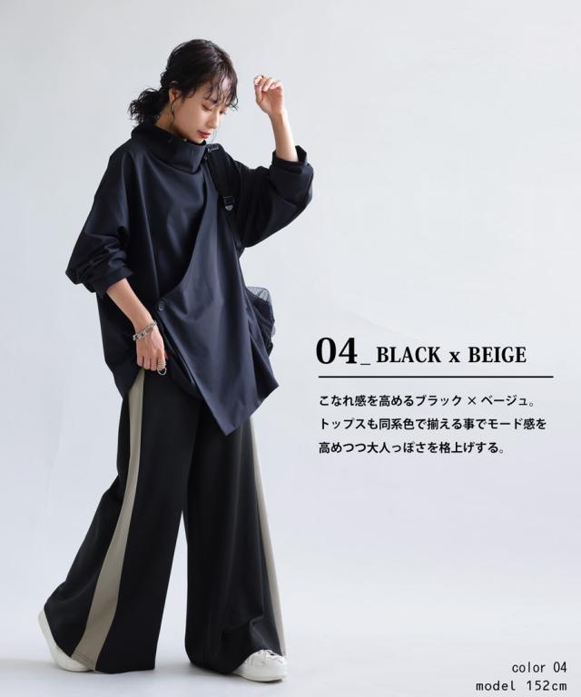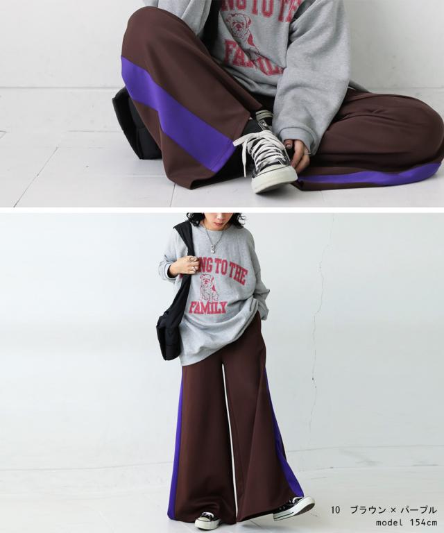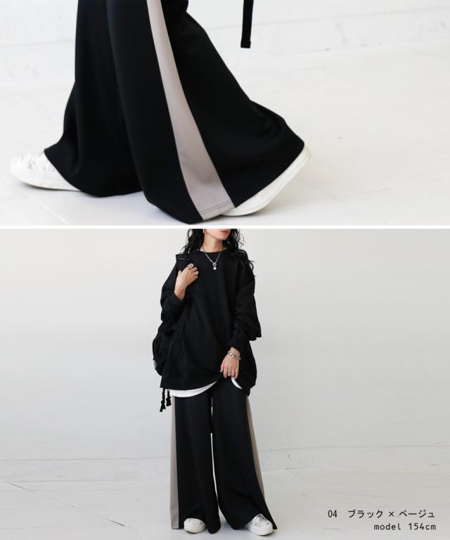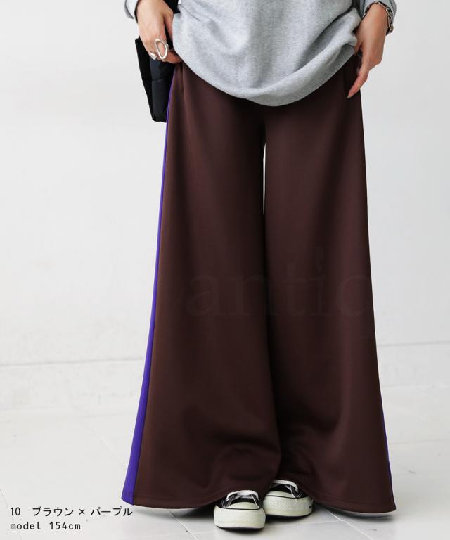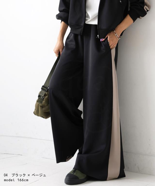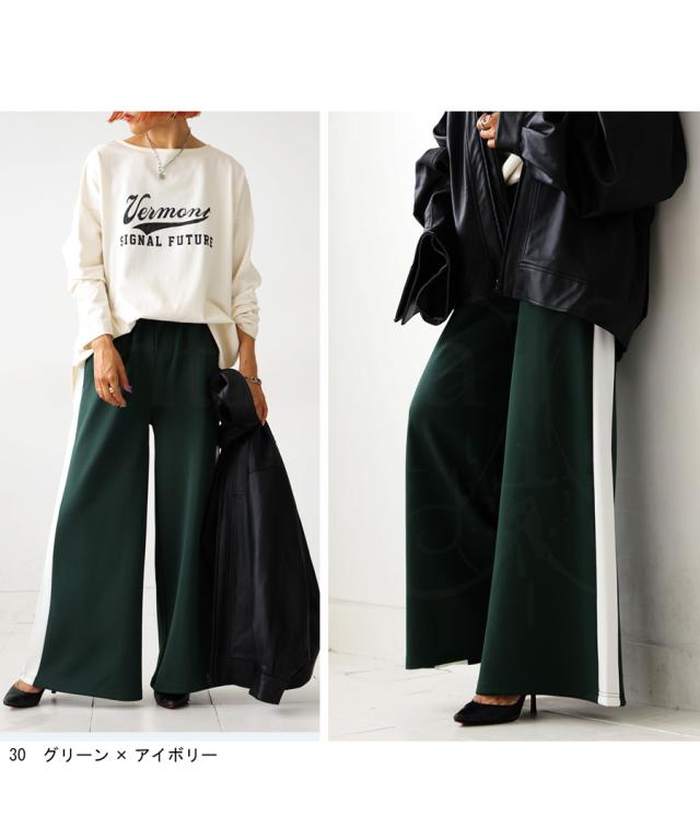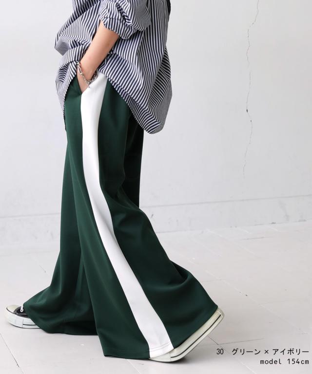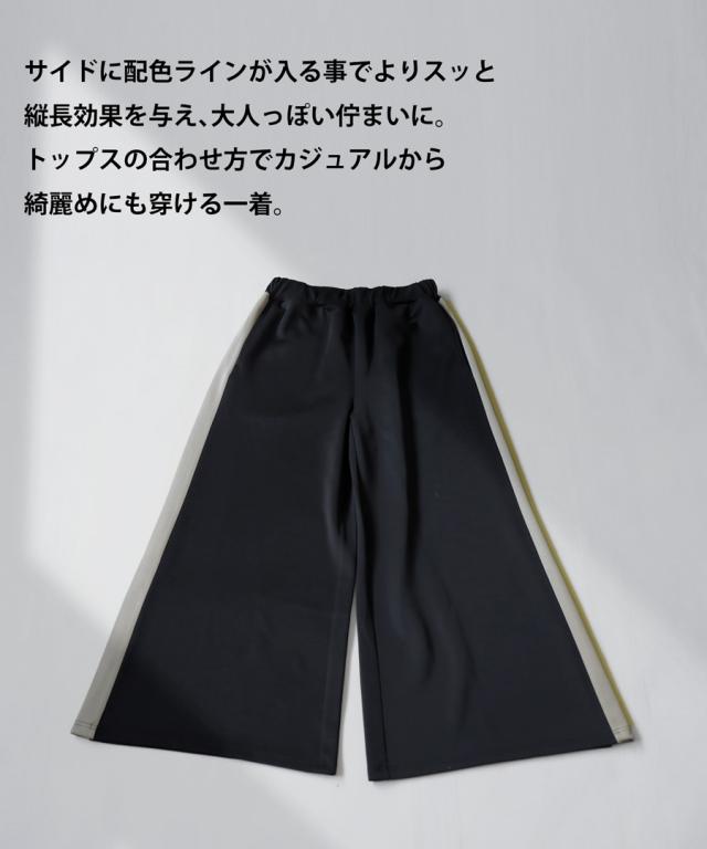 目を惹くライン配色で即決まるワイドパンツ。