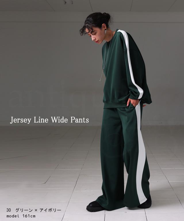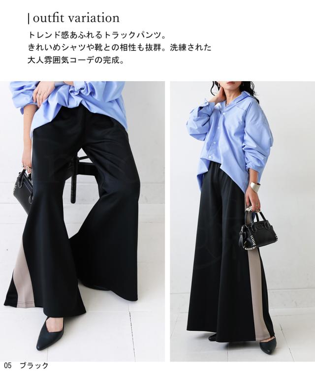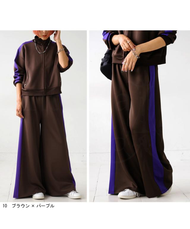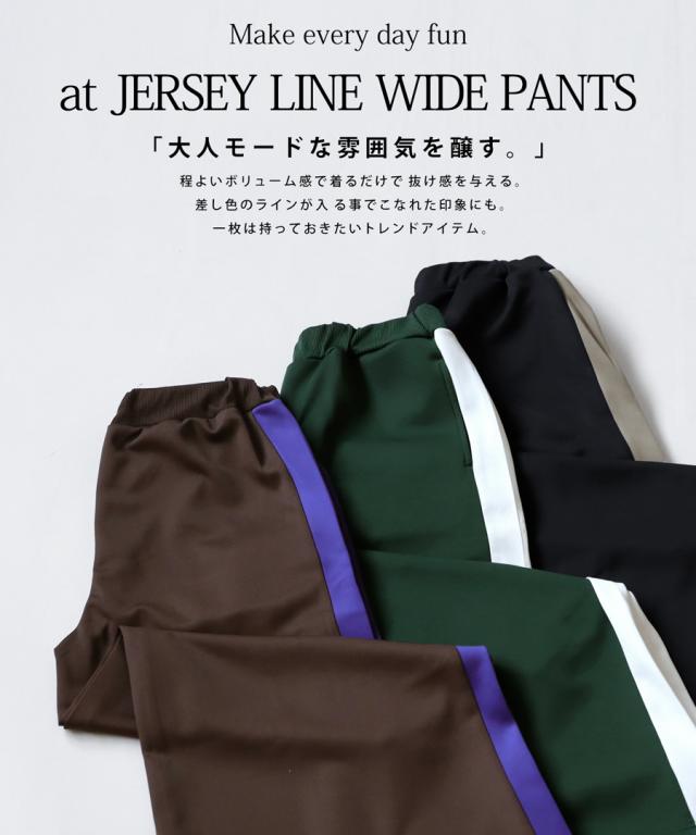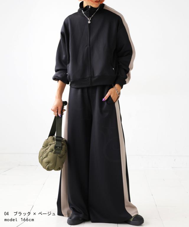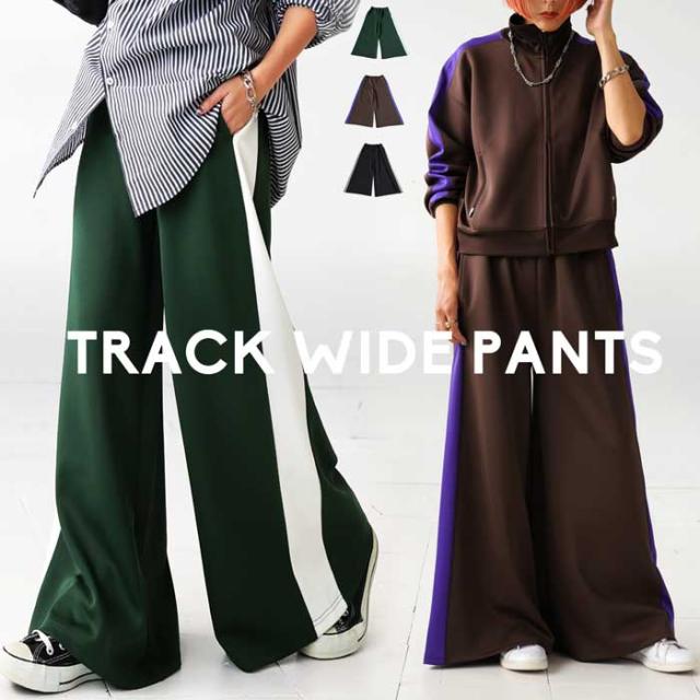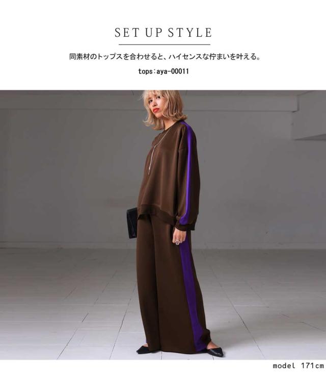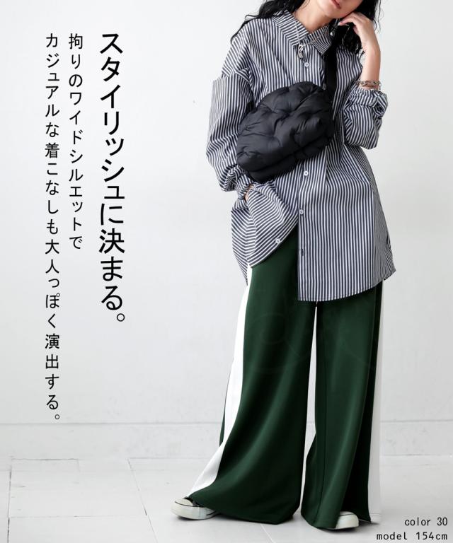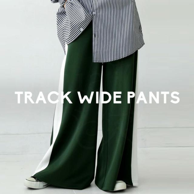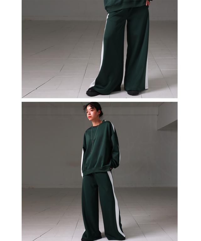 目を惹くライン配色で即決まるワイドパンツ。