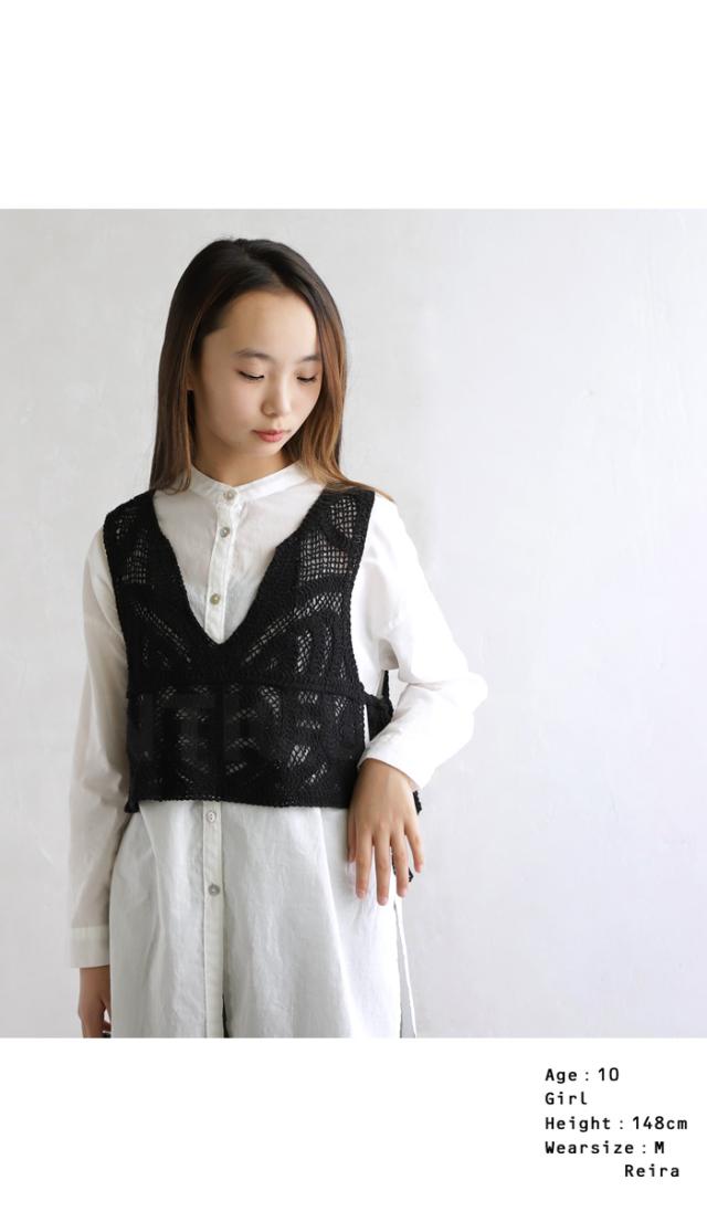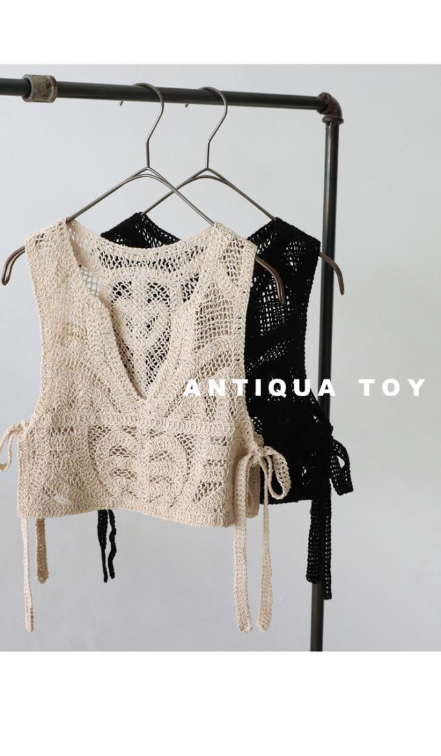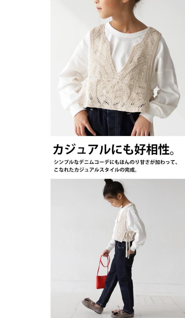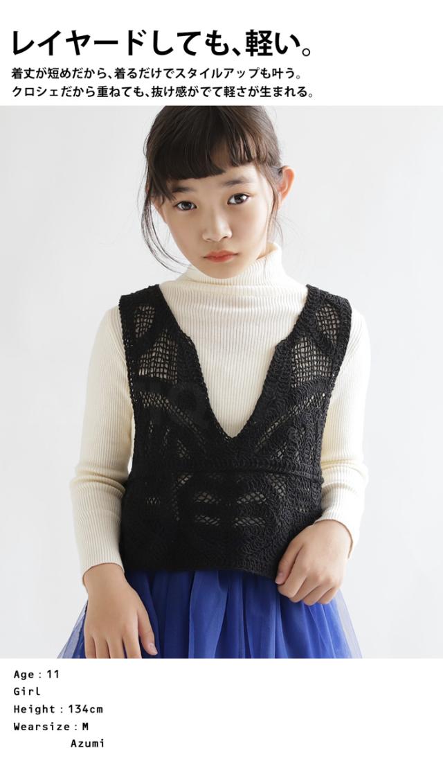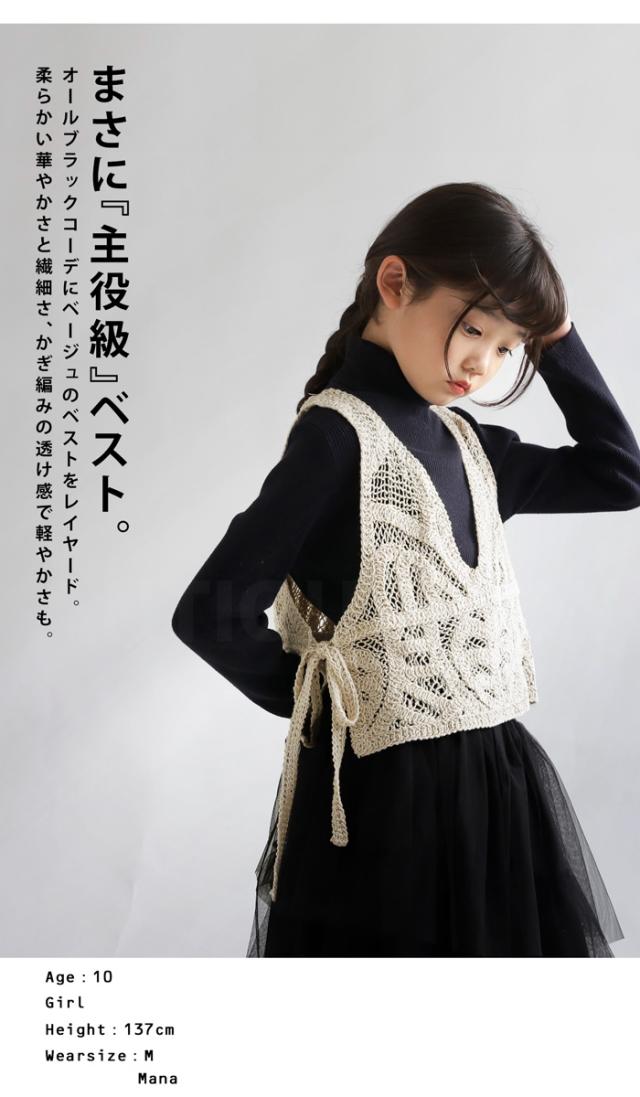 キッズ 子供服 女の子 ジュニア 低学年 高学年 ショート丈 クロシェ編み かぎ針編み ビスチェ サイドリボン ゆったり Vネック リーフ柄 柄編み シアーニット アンティカ