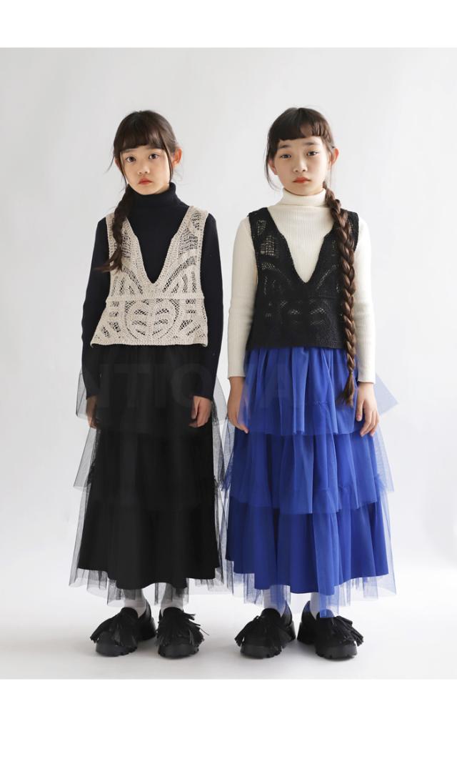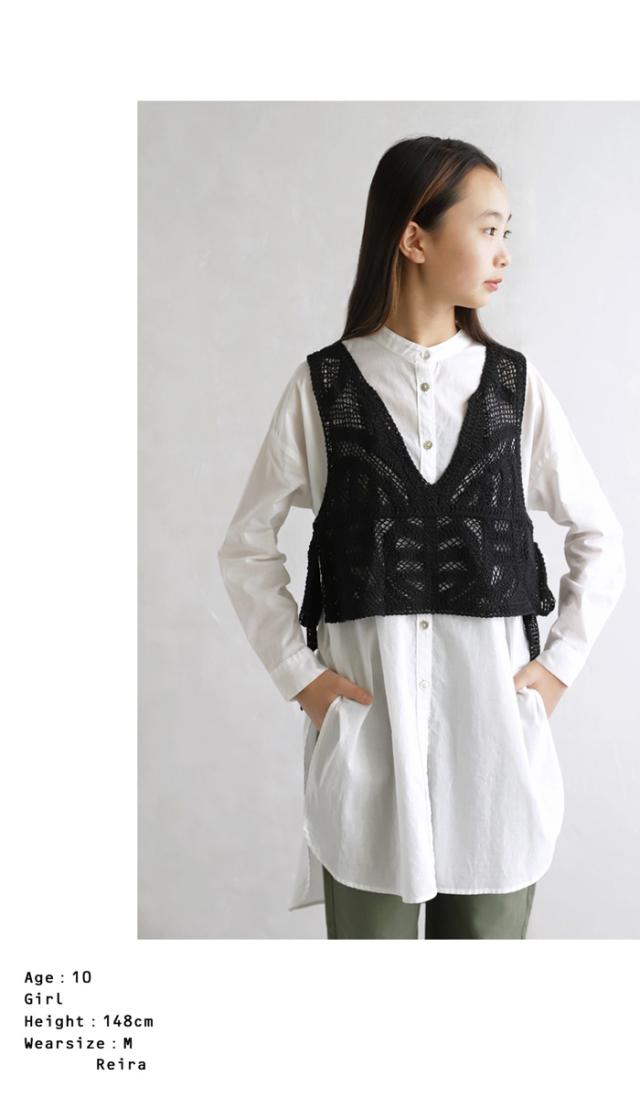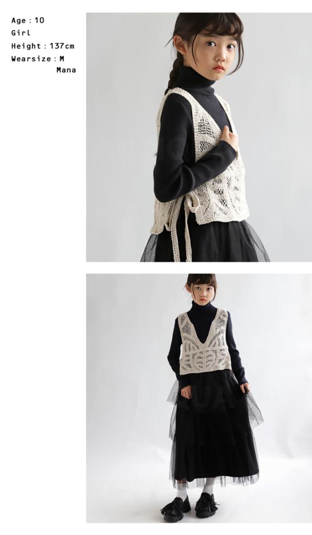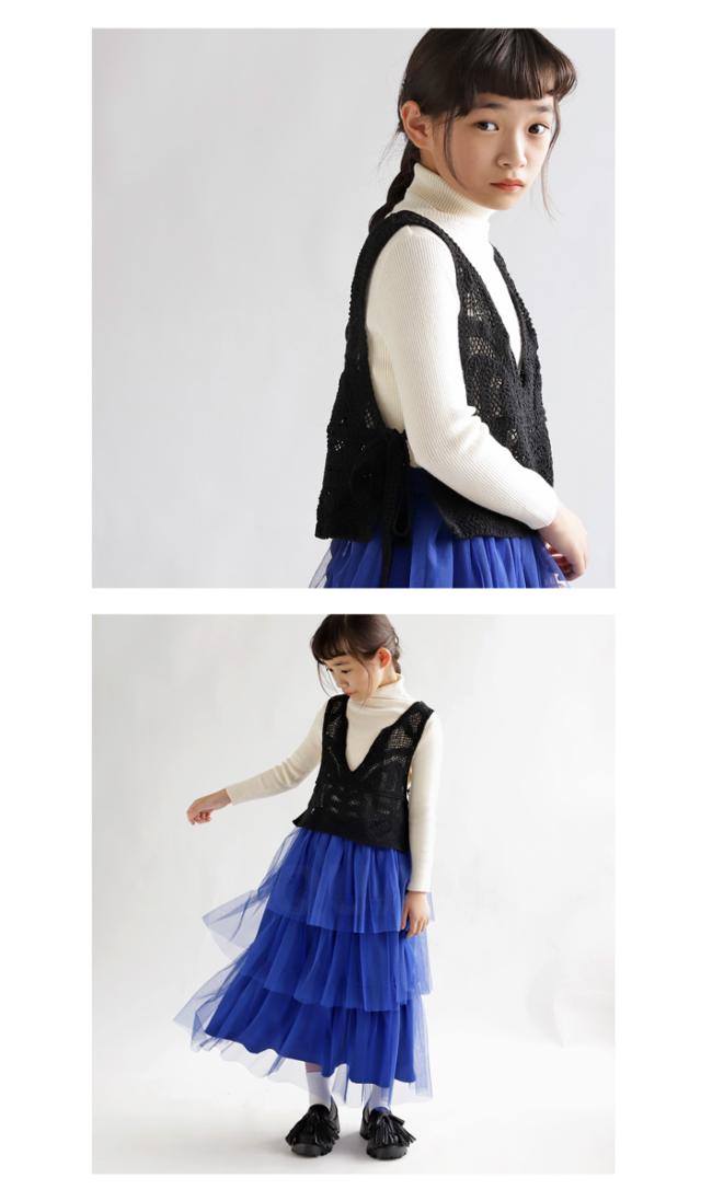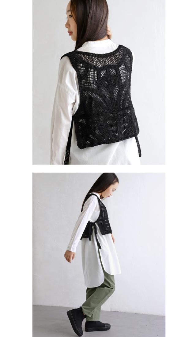 キッズ 子供服 女の子 ジュニア 低学年 高学年 ショート丈 クロシェ編み かぎ針編み ビスチェ サイドリボン ゆったり Vネック リーフ柄 柄編み シアーニット アンティカ