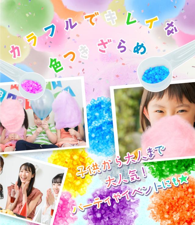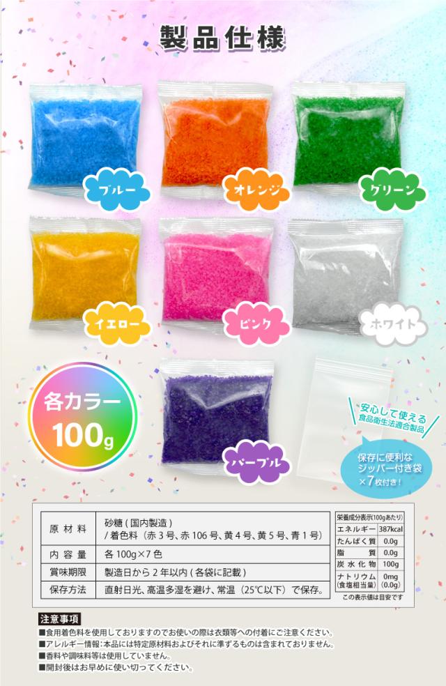 わたあめ機でカラフルな色つきのわたあめを作ったり、いろんなスイーツのアレンジに使えるカラフルな7色のざらめセット★