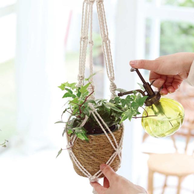 コットンロープをマクラメ編で編み上げたプラントハンガーと天然素材のシーグラスポットの組み合わせは、温かみのある優しい雰囲気を作り、どんなインテリアにもおしゃれに馴染みます。