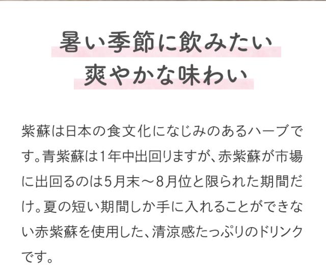 お召し上がり方:シソ本来の色と味、香りが楽しめる濃縮飲料です。冷水で4〜5倍にうすめてお召し上がりください。