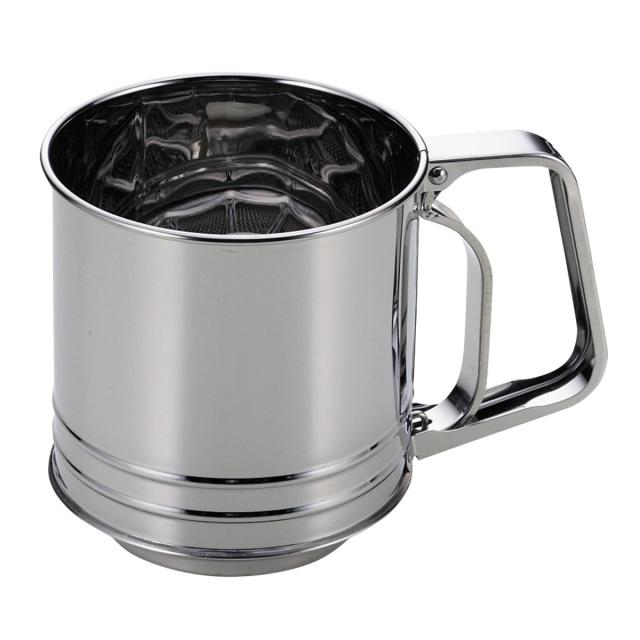 ステンレス製自動粉ふるいは、持ち手のついたカップ型になっており、片手でハンドルを握ったり離したりするだけで、素早く粉をふるうことが可能です。粉ふるいを左右に動かす必要もないため、粉がまわりに飛び散らないのも嬉しいポイントです。サビに強く衛生的なステンレス製です。