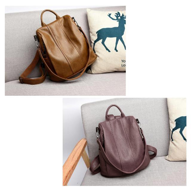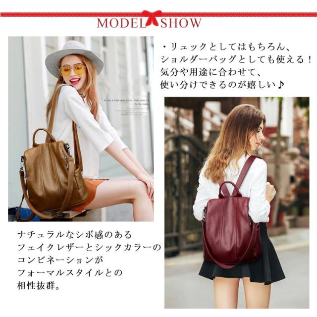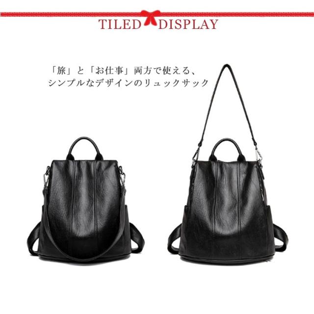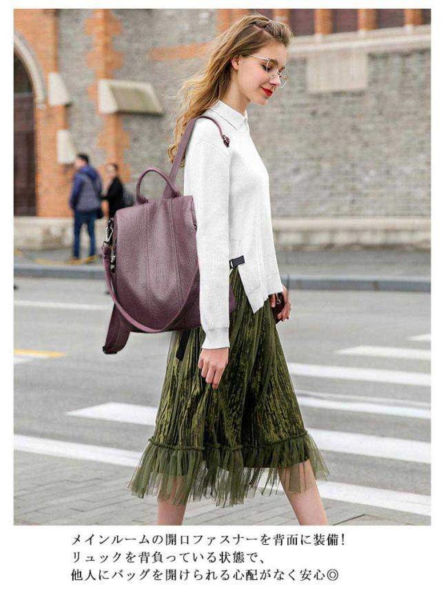 | ・女性らしいサイズ感と実用性を兼ね揃えた防犯リュック♪ ・「旅」と「お仕事」両方で使える、シンプルなデザインのリュックサック ・メインルームの開口ファスナーを背面に装備!リュックを背負っている状態で、他人にバッグを開けられる心配がなく安心◎ ・リュック正面にファスナー開口が目立たないように設計した縦型ファスナーを2ヶ所配置し、スマホやパスケースなど取り出し頻度の高いアイテムの収納に便利! ・リュックとしてはもちろん、ショルダーバッグとしても使える!気分や用途に合わせて、使い分けできるのが嬉しい♪ ・ナチュラルなシボ感のあるフェイクレザーとシックカラーのコンビネーションがフォーマルスタイルとの相性抜群。 ・通勤用やオフィス用にはもちろん、女子旅用のサブバッグにもオススメ。 | |