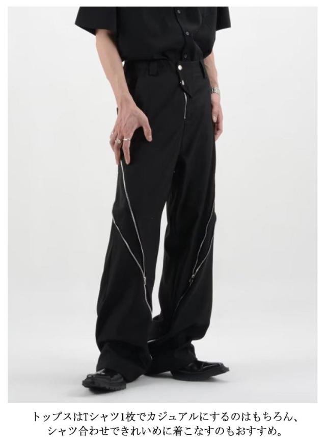 | 大胆なファスナーディテールがモードな印象のワイドパンツ。 すとんと縦に落ちるすっきりしたシルエットを採用。 トップスはTシャツ1枚でカジュアルにするのはもちろん、シャツ合わせできれいめに着こなすのもおすすめ。 足元は厚底シューズを選ぶとさらに脚長効果を発揮できます。 | |