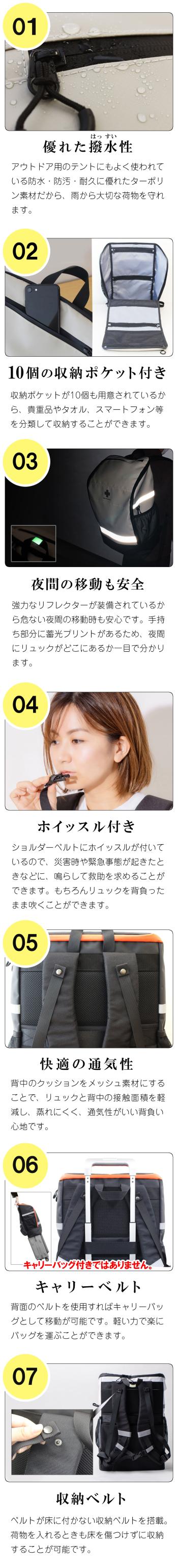 | 抗菌・防臭リュック×1 | カラー:ブラック ベージュ 容量:約35リットル サイズ:幅約33cm×奥行19cm×高さ48cm 素材:ターポリン、ポリエステル、その他、内部は抗菌・防臭加工 |