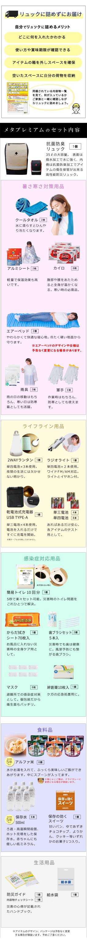 | 保存の効くスイーツ×1 | 甘いパン、ようかん、クッキー等、いずれかのお菓子が1つ入ってます |