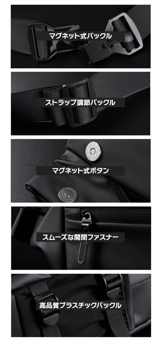 旅先で感じた「バッグを下ろさず、片手で一瞬で開閉できたら…」という想いから、磁力で自動ロックする「マグネット式バックル」を採用。