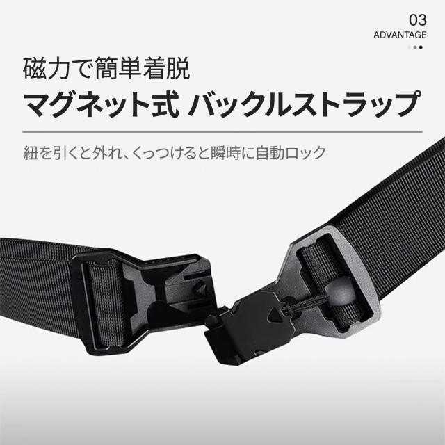 ・一瞬で着脱:紐を引くと外れ、近づけると自動ロック。磁力バックルが革新的。