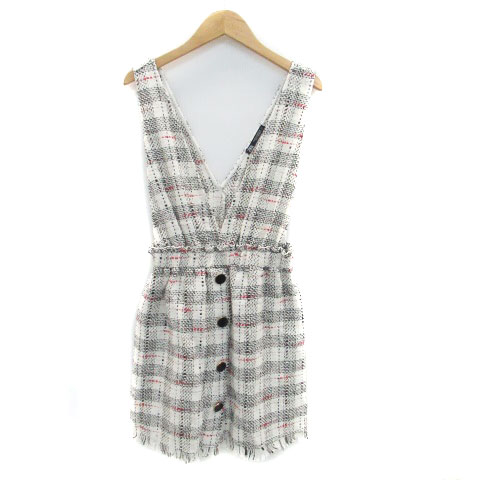 【中古】ザラ ジャンパースカート Vネック ノースリーブ ミニ丈 チェック柄 フリンジ XS オフホワイト 黒 レディース