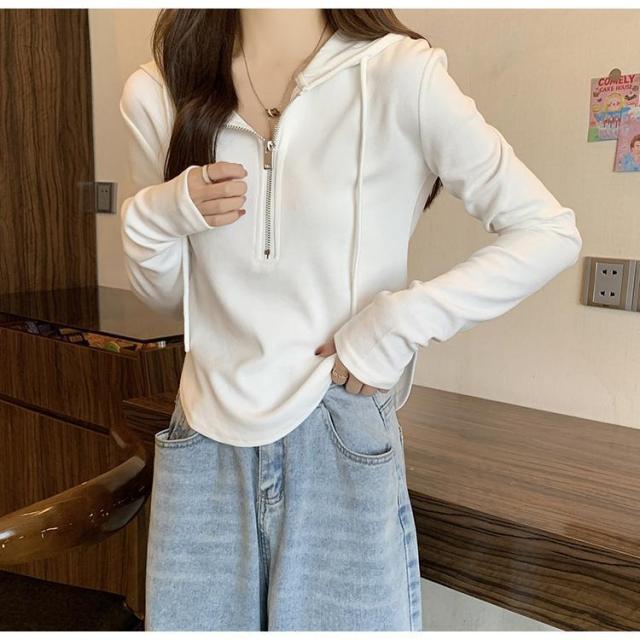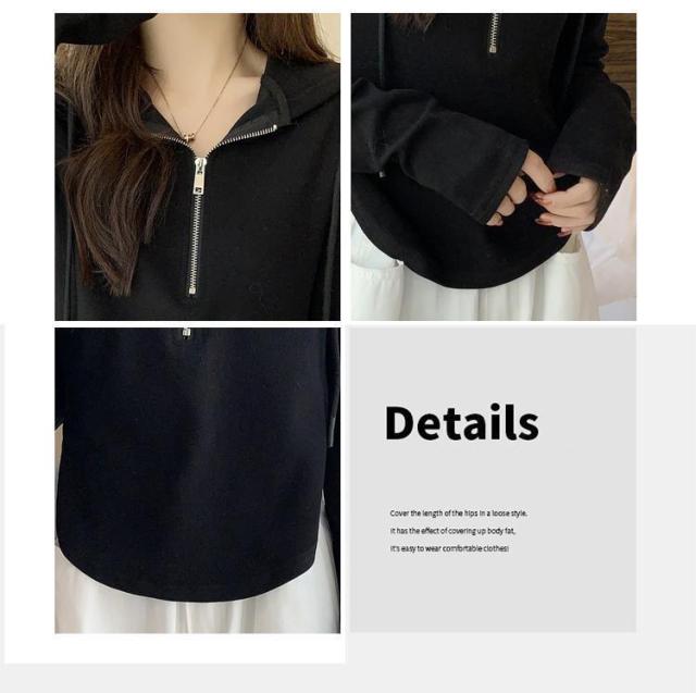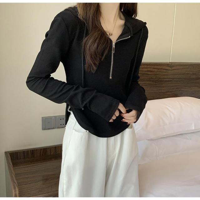 長袖 パーカー レディース プルオーバー ハーフジッパー トップス 長袖tシャツ 春秋 ショート丈 カットソー シンプル 着まわし 細身 韓国ファッション