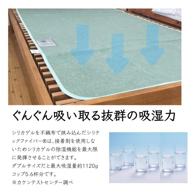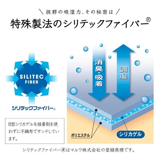 B型シリカゲルを特殊製法により不織布に挟み込んだ生地を使用しており、最大吸湿量シングルサイズで約780g(コップ3.9杯分)の優れた除湿機能のあるマットです。 消臭性にも優れており、代表的なニオイ成分を2時間後には99%減少させます。(環境によりことなります) B型シリカゲルの特徴として、除湿するだけでなく放湿し適度な湿度に保ってくれる機能もあります。 天日干しまたはふとん乾燥機などで乾燥させることで繰り返し何度でも使用可能です。 添付の吸湿センサーで干し時のタイミングも一目でわかります 吸湿センサーの色がブルー色からピンク色に変わった時を目安に天日干し、もしくはふとん乾燥機で2〜3時間ほど乾燥させてください。 ベッドマットレスとベッドフレームの間や、マットレスとベッドパットの間、敷布団の下などに敷いてご使用ください。 押し入れなどに収納する際に使用するのもおすすめです。 |