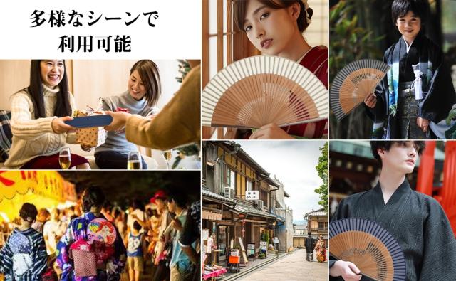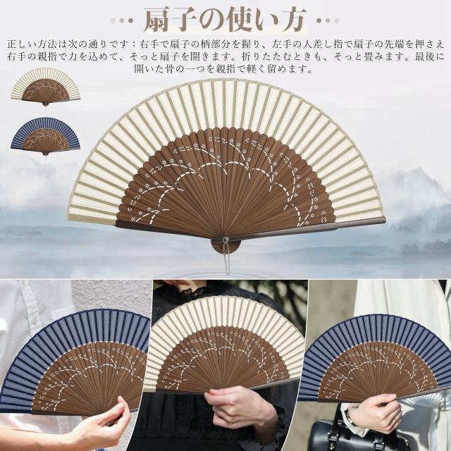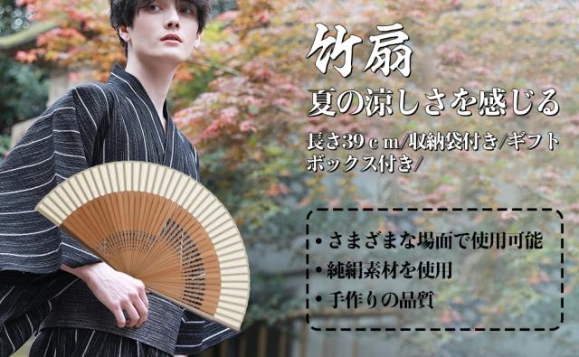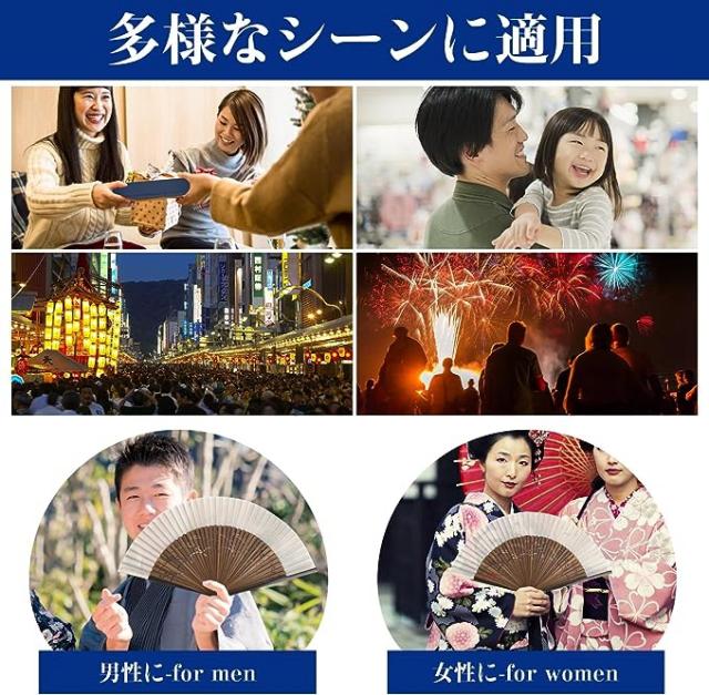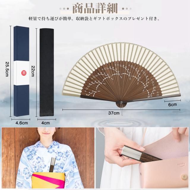 | 本扇子は折りたたみ式でコンパクト、短くて33gだけで、着物や浴衣などの帯に挿すとか鞄に入れるとか邪魔にならなくて持ち運びやすいです。扇子を保護し、携帯に便利な収納袋が付属します。 | |